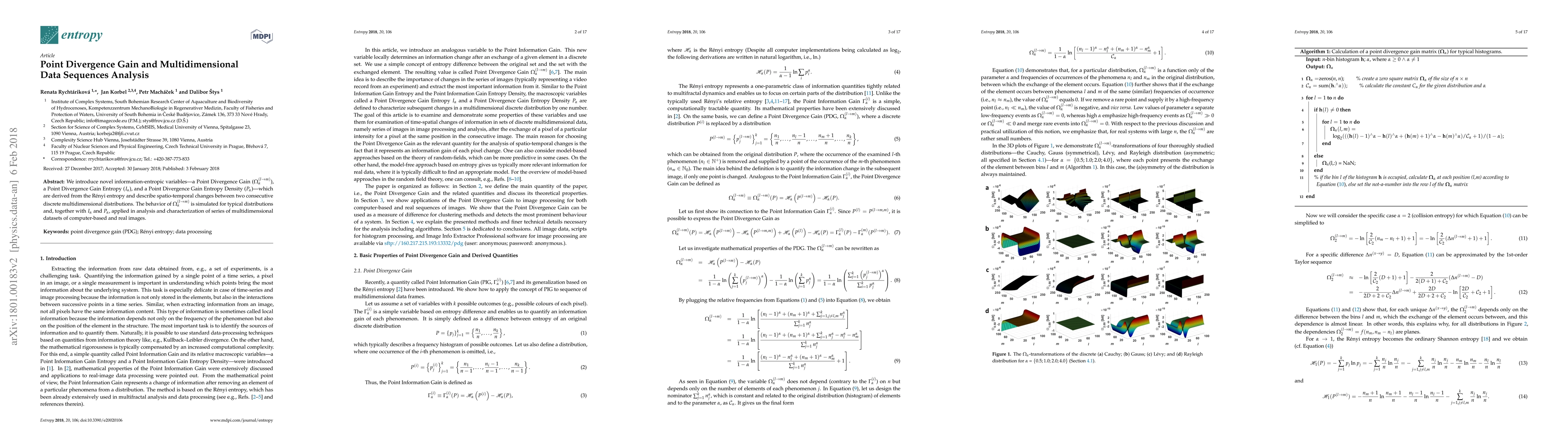 We introduce novel information-entropic variables -- a Point Divergence Gain (${\Omega}^{(l \rightarrow m)}_\alpha$), a Point Divergence Gain Entropy ($I_\alpha$), and a Point Divergence Gain Entropy Density ($P_\alpha$) -- which are derived from the R\'{e}nyi entropy and describe spatio-temporal changes between two consecutive discrete multidimensional distributions. The behavior of ${\Omega}^{(l \rightarrow m)}_\alpha$ is simulated for typical distributions and, together with $I_\alpha$ and $P_\alpha$, applied in analysis and characterization of series of multidimensional datasets of computer-based and real images.