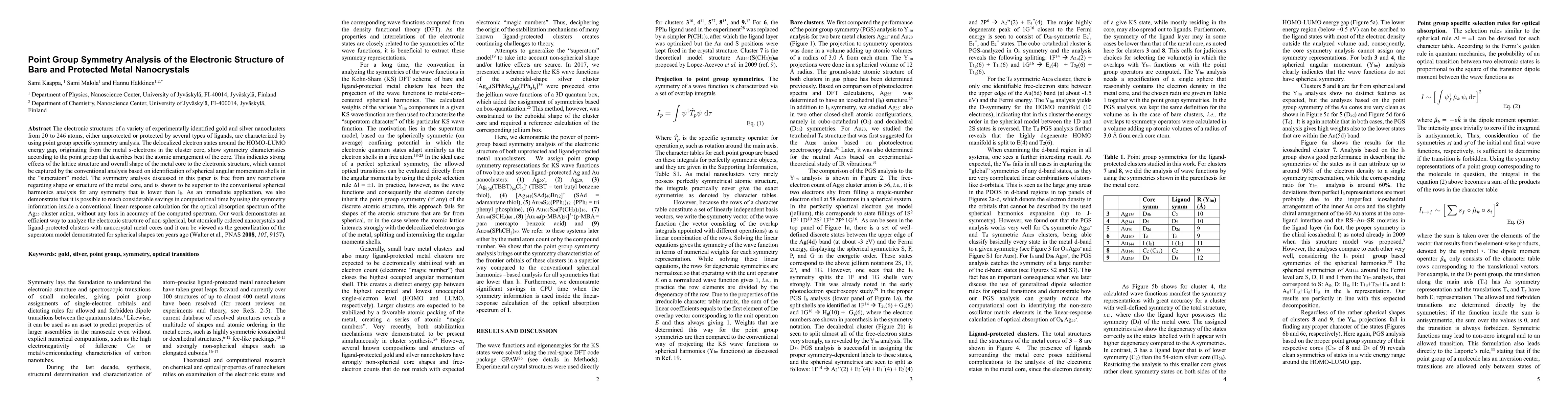 The electronic structures of a variety of experimentally identified gold and silver nanoclusters from 20 to 246 atoms, either unprotected or protected by several types of ligands, are characterized by using point group specific symmetry analysis. The delocalized electron states around the HOMO-LUMO energy gap, originating from the metal s-electrons in the cluster core, show symmetry characteristics according to the point group that describes best the atomic arrangement of the core. This indicates strong effects of the lattice structure and overall shape of the metal core to the electronic structure, which cannot be captured by the conventional analysis based on identification of spherical angular momentum shells in the superatom model. The symmetry analysis discussed in this paper is free from any restrictions regarding shape or structure of the metal core, and is shown to be superior to the conventional spherical harmonics analysis for any symmetry that is lower than Ih. As an immediate application, we also demonstrate that it is possible to reach considerable savings in computational time by using the symmetry information inside a conventional linear-response calculation for the optical absorption spectrum of the Ag55 cluster anion, without any loss in accuracy of the computed spectrum. Our work demonstrates an efficient way to analyze the electronic structure of non-spherical, but atomically ordered nanocrystals and ligand-protected clusters with nanocrystal metal cores and it can be viewed as the generalization of the superatom model demonstrated for spherical shapes ten years ago (Walter et al., PNAS 2008, 105, 9157).