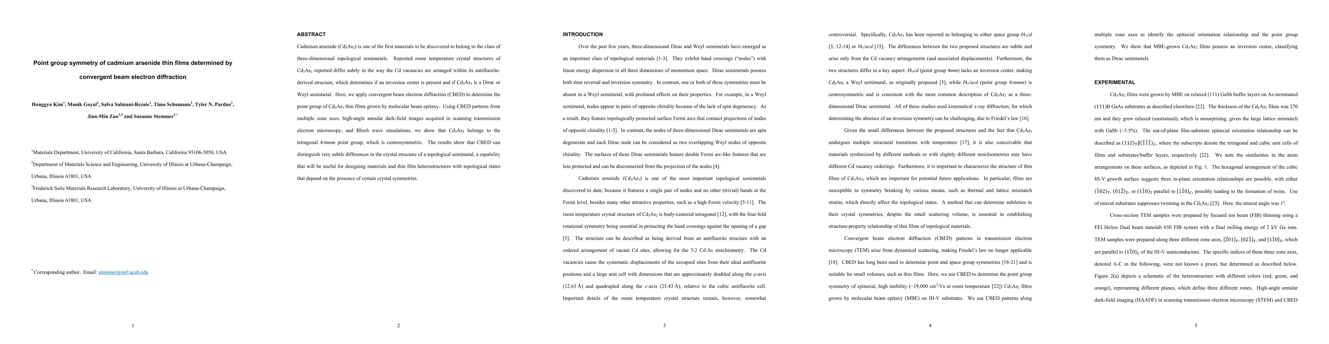 This study uses convergent beam electron diffraction to determine that cadmium arsenide (Cd3As2) thin films belong to the tetragonal 4/mmm point group, confirming their centrosymmetry. This insight is crucial for understanding the material's topological properties and for designing related heterostructures.