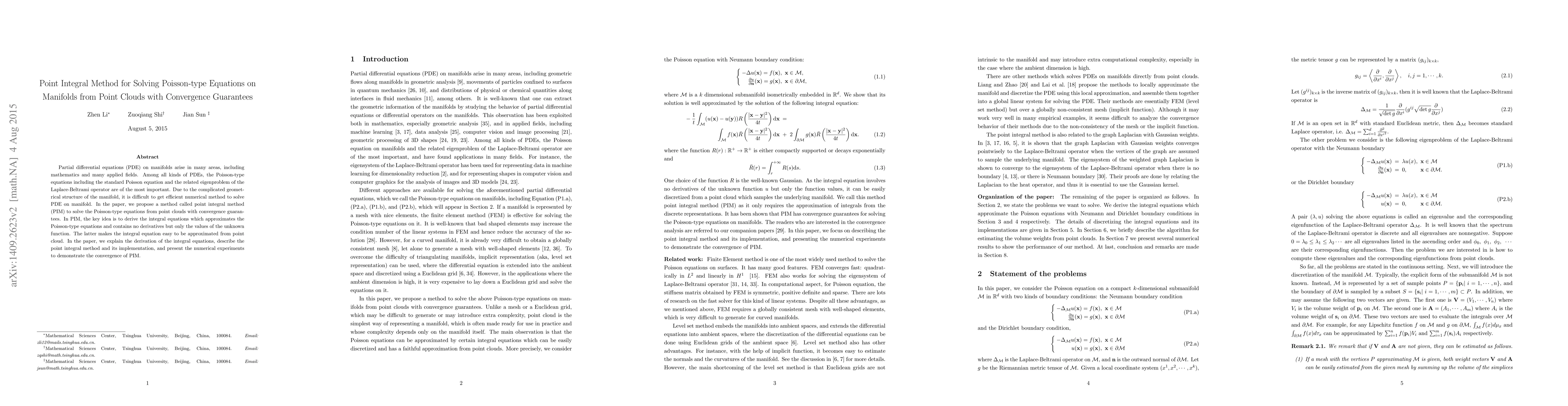 Partial differential equations (PDE) on manifolds arise in many areas, including mathematics and many applied fields. Among all kinds of PDEs, the Poisson-type equations including the standard Poisson equation and the related eigenproblem of the Laplace-Beltrami operator are of the most important. Due to the complicated geometrical structure of the manifold, it is difficult to get efficient numerical method to solve PDE on manifold. In the paper, we propose a method called point integral method (PIM) to solve the Poisson-type equations from point clouds with convergence guarantees. In PIM, the key idea is to derive the integral equations which approximates the Poisson-type equations and contains no derivatives but only the values of the unknown function. The latter makes the integral equation easy to be approximated from point cloud. In the paper, we explain the derivation of the integral equations, describe the point integral method and its implementation, and present the numerical experiments to demonstrate the convergence of PIM.