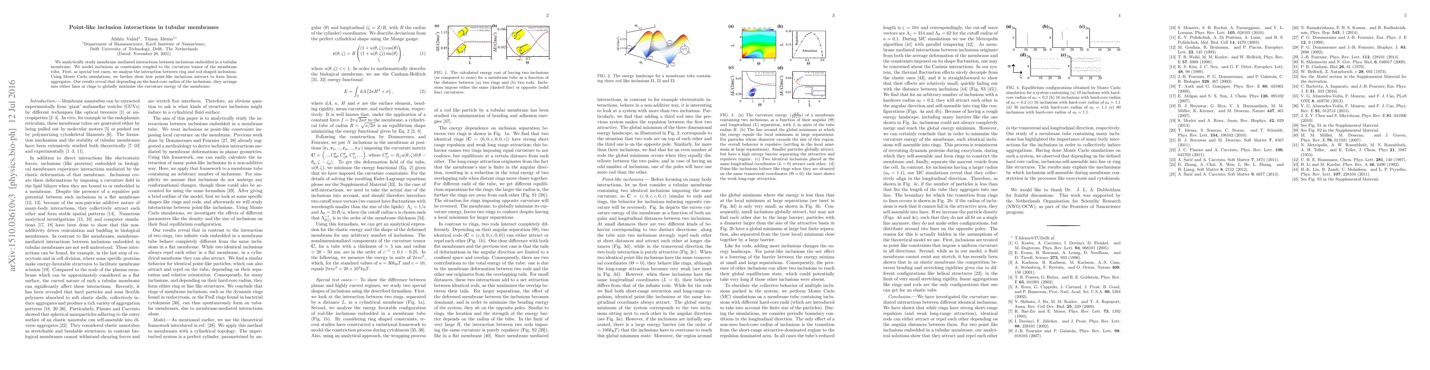 We analytically study membrane mediated interactions between inclusions embedded in a tubular membrane. We model inclusions as constraints coupled to the curvature tensor of the membrane tube. First, as special test cases, we analyze the interaction between ring and rod shaped inclusions. Using Monte Carlo simulations, we further show how point-like inclusions interact to form linear aggregates. Our results reveal that depending on the hard-core radius of the inclusions, they arrange into either lines or rings to globally minimize the curvature energy of the membrane.