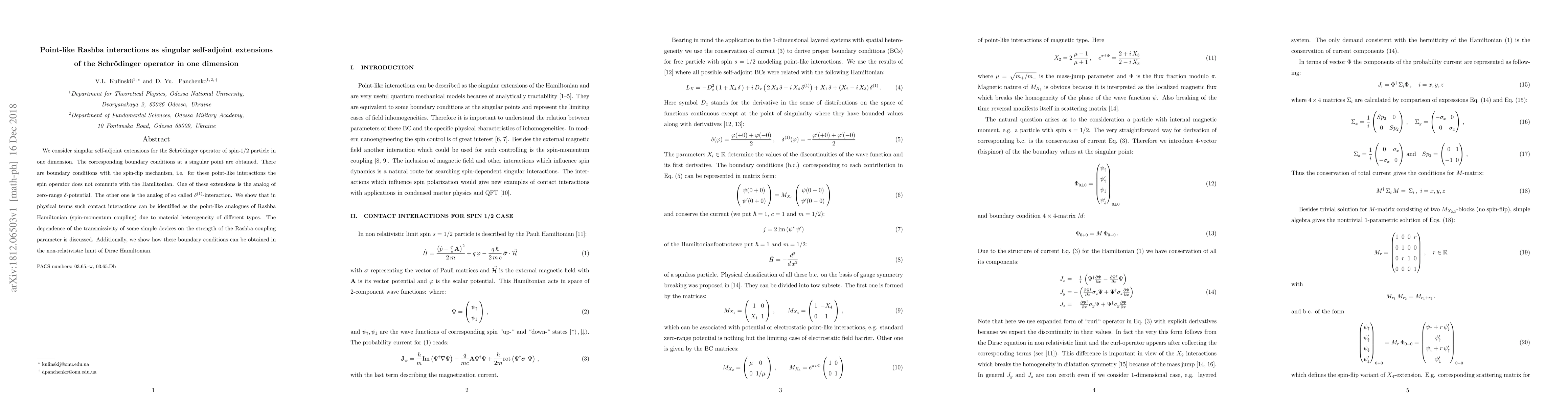 This paper investigates singular self-adjoint extensions of the one-dimensional Schrödinger operator for a spin-1/2 particle, identifying point-like Rashba interactions as spin-flip mechanisms. It discusses the transmissivity of devices influenced by the Rashba coupling parameter and derives these boundary conditions from the non-relativistic limit of the Dirac Hamiltonian.
