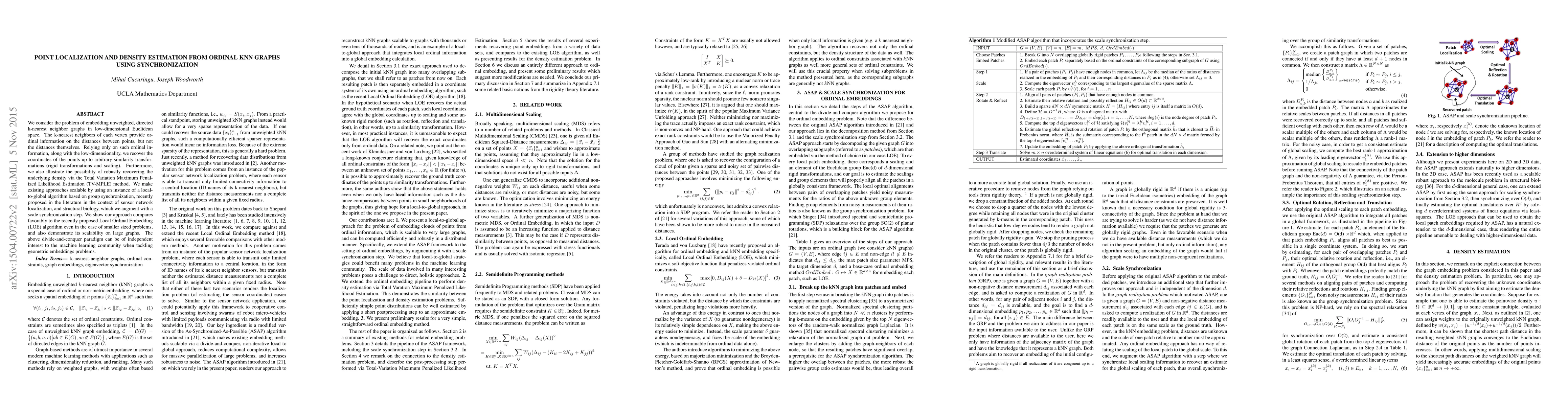 Researchers developed an approach to localize points in low-dimensional space using ordinal kNN graphs, recovering coordinates up to similarity transformations and estimating density through a robust method.
