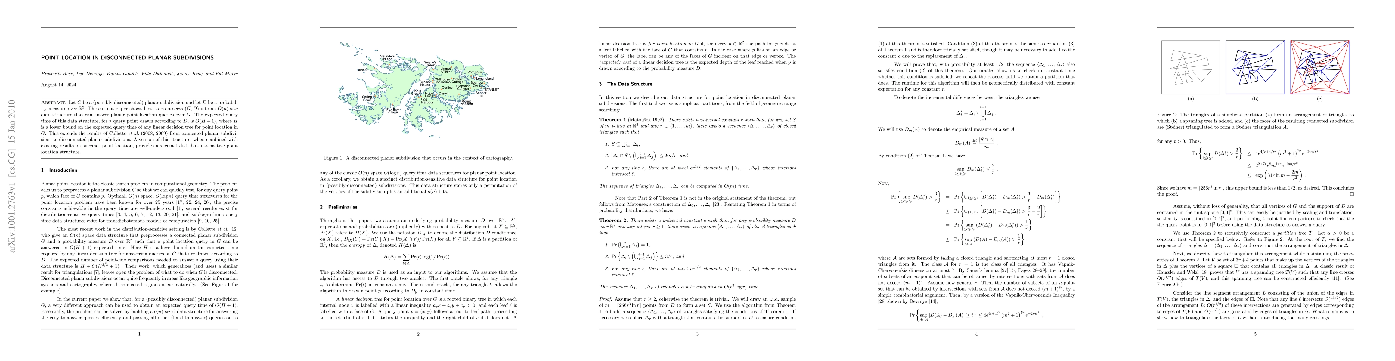Let $G$ be a (possibly disconnected) planar subdivision and let $D$ be a probability measure over $\R^2$. The current paper shows how to preprocess $(G,D)$ into an O(n) size data structure that can answer planar point location queries over $G$. The expected query time of this data structure, for a query point drawn according to $D$, is $O(H+1)$, where $H$ is a lower bound on the expected query time of any linear decision tree for point location in $G$. This extends the results of Collette et al (2008, 2009) from connected planar subdivisions to disconnected planar subdivisions. A version of this structure, when combined with existing results on succinct point location, provides a succinct distribution-sensitive point location structure.