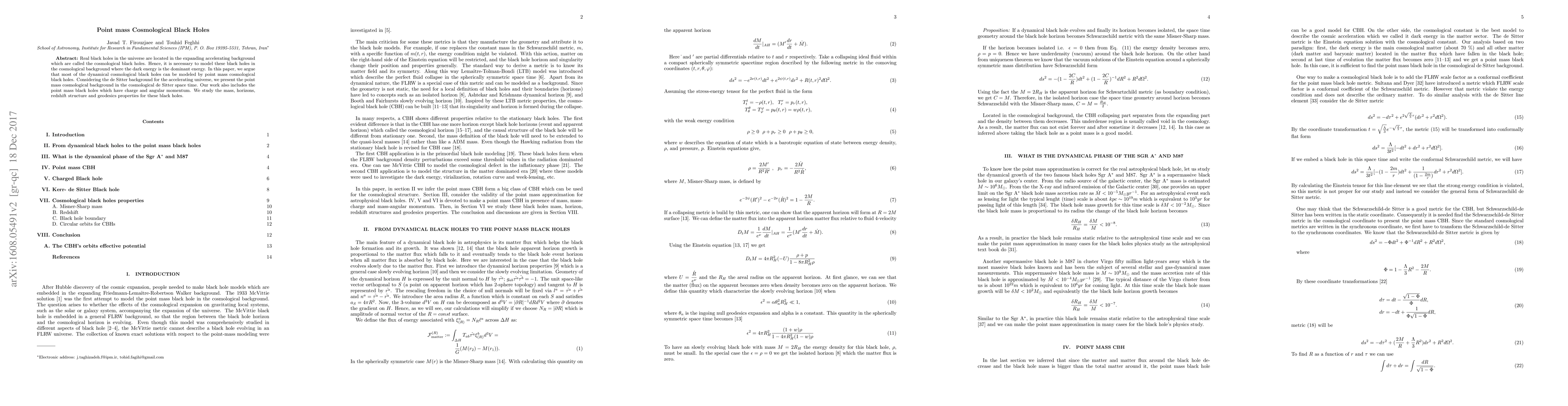 This paper proposes that most dynamical cosmological black holes can be modeled as point mass cosmological black holes in a de Sitter background dominated by dark energy. It examines the properties of these black holes, including mass, horizons, redshift structure, and geodesics, considering charged and rotating variants.
