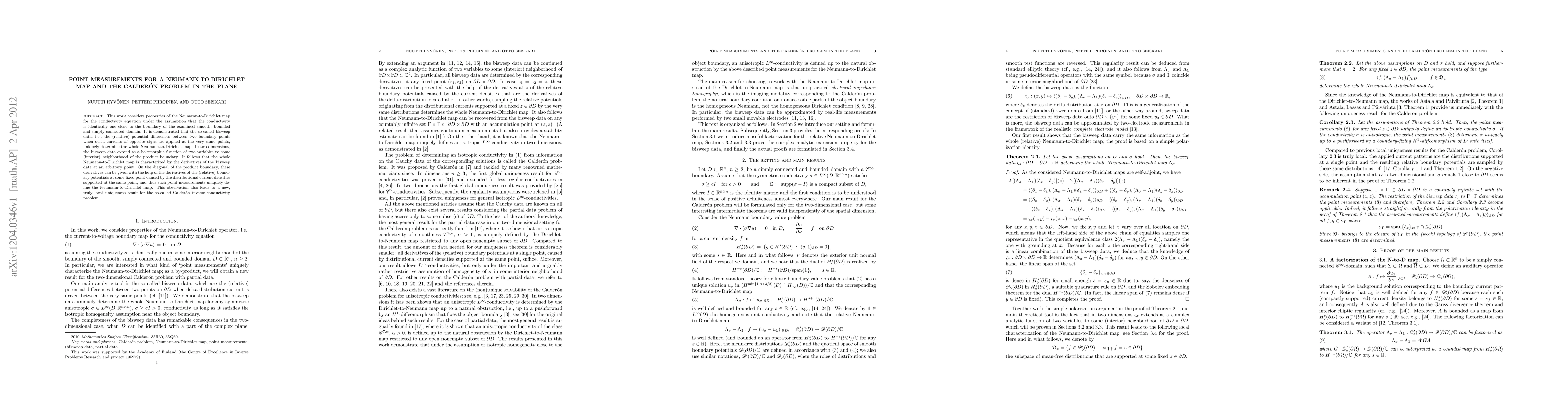 This paper explores the properties of the Neumann-to-Dirichlet map for the conductivity equation in two-dimensional domains, showing that bisweep data uniquely determine the map, leading to local uniqueness for the Calderón inverse conductivity problem. Point measurements of the derivatives of bisweep data on the boundary uniquely define the entire Neumann-to-Dirichlet map.