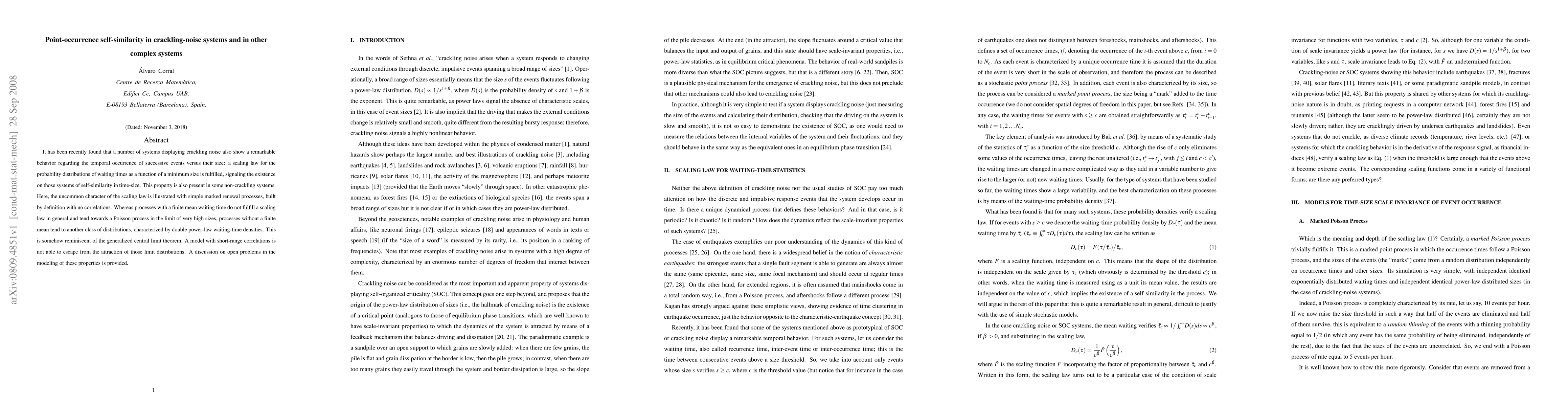 It has been recently found that a number of systems displaying crackling noise also show a remarkable behavior regarding the temporal occurrence of successive events versus their size: a scaling law for the probability distributions of waiting times as a function of a minimum size is fulfilled, signaling the existence on those systems of self-similarity in time-size. This property is also present in some non-crackling systems. Here, the uncommon character of the scaling law is illustrated with simple marked renewal processes, built by definition with no correlations. Whereas processes with a finite mean waiting time do not fulfill a scaling law in general and tend towards a Poisson process in the limit of very high sizes, processes without a finite mean tend to another class of distributions, characterized by double power-law waiting-time densities. This is somehow reminiscent of the generalized central limit theorem. A model with short-range correlations is not able to escape from the attraction of those limit distributions. A discussion on open problems in the modeling of these properties is provided.