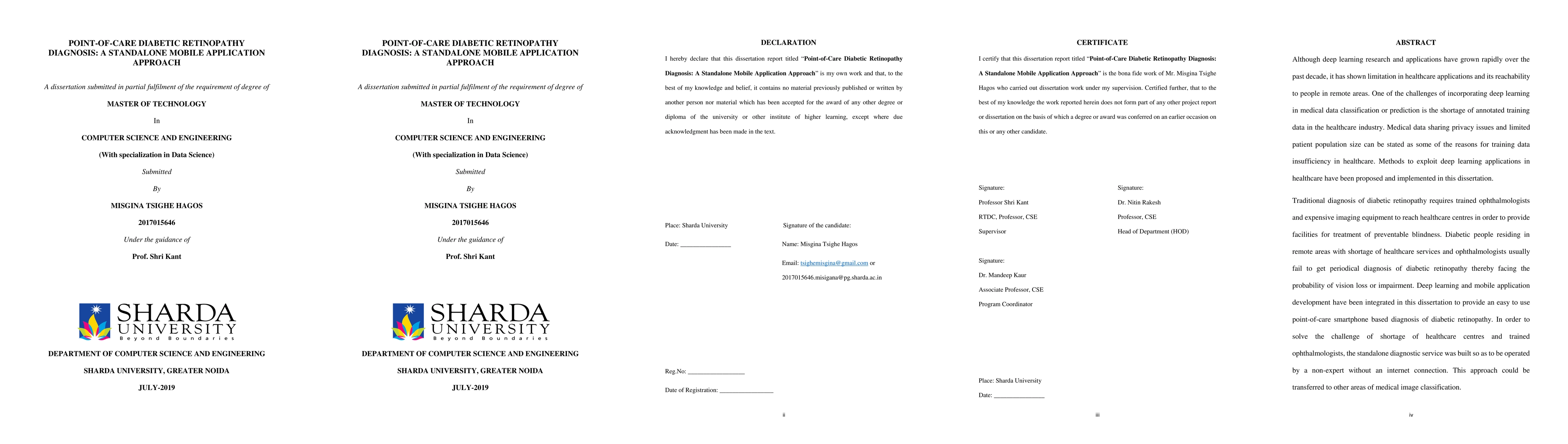 Although deep learning research and applications have grown rapidly over the past decade, it has shown limitation in healthcare applications and its reachability to people in remote areas. One of the challenges of incorporating deep learning in medical data classification or prediction is the shortage of annotated training data in the healthcare industry. Medical data sharing privacy issues and limited patient population size can be stated as some of the reasons for training data insufficiency in healthcare. Methods to exploit deep learning applications in healthcare have been proposed and implemented in this dissertation. Traditional diagnosis of diabetic retinopathy requires trained ophthalmologists and expensive imaging equipment to reach healthcare centres in order to provide facilities for treatment of preventable blindness. Diabetic people residing in remote areas with shortage of healthcare services and ophthalmologists usually fail to get periodical diagnosis of diabetic retinopathy thereby facing the probability of vision loss or impairment. Deep learning and mobile application development have been integrated in this dissertation to provide an easy to use point-of-care smartphone based diagnosis of diabetic retinopathy. In order to solve the challenge of shortage of healthcare centres and trained ophthalmologists, the standalone diagnostic service was built so as to be operated by a non-expert without an internet connection. This approach could be transferred to other areas of medical image classification.