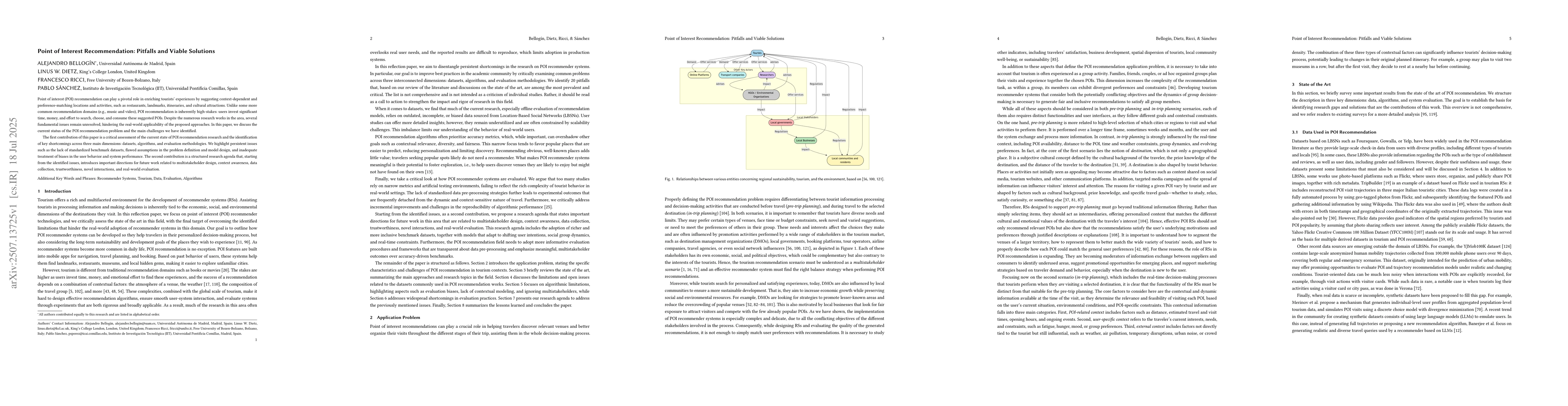 Point of interest (POI) recommendation can play a pivotal role in enriching tourists' experiences by suggesting context-dependent and preference-matching locations and activities, such as restaurants, landmarks, itineraries, and cultural attractions. Unlike some more common recommendation domains (e.g., music and video), POI recommendation is inherently high-stakes: users invest significant time, money, and effort to search, choose, and consume these suggested POIs. Despite the numerous research works in the area, several fundamental issues remain unresolved, hindering the real-world applicability of the proposed approaches. In this paper, we discuss the current status of the POI recommendation problem and the main challenges we have identified. The first contribution of this paper is a critical assessment of the current state of POI recommendation research and the identification of key shortcomings across three main dimensions: datasets, algorithms, and evaluation methodologies. We highlight persistent issues such as the lack of standardized benchmark datasets, flawed assumptions in the problem definition and model design, and inadequate treatment of biases in the user behavior and system performance. The second contribution is a structured research agenda that, starting from the identified issues, introduces important directions for future work related to multistakeholder design, context awareness, data collection, trustworthiness, novel interactions, and real-world evaluation.