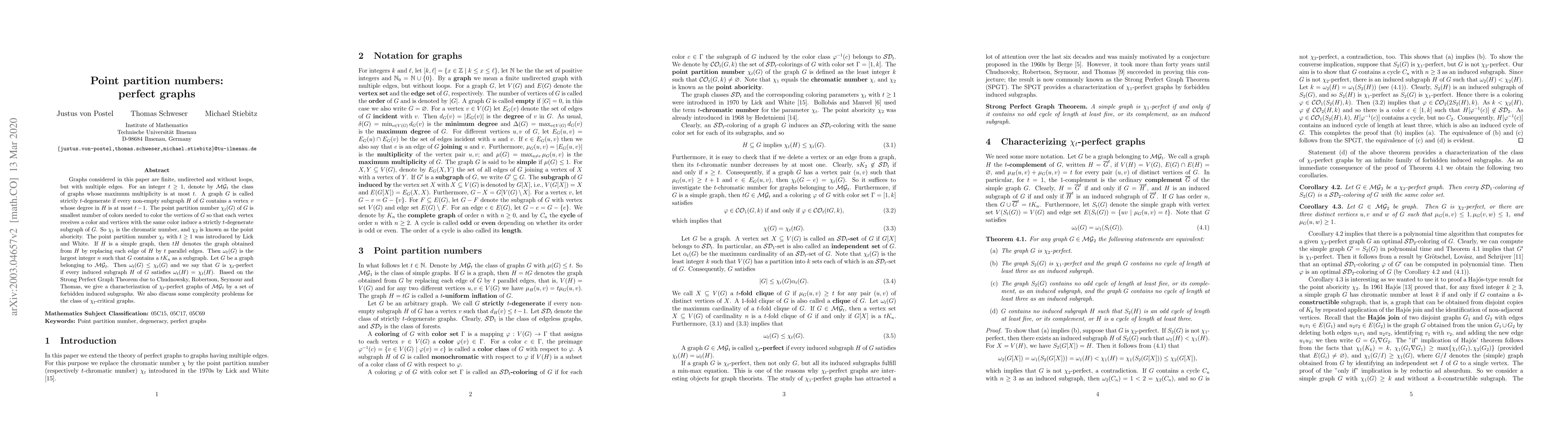 Graphs considered in this paper are finite, undirected and without loops, but with multiple edges. For an integer $t\geq 1$, denote by $\mathcal{MG}_t$ the class of graphs whose maximum multiplicity is at most $t$. A graph $G$ is called strictly $t$-degenerate if every non-empty subgraph $H$ of $G$ contains a vertex $v$ whose degree in $H$ is at most $t-1$. The point partition number $\chi_t(G)$ of $G$ is smallest number of colors needed to color the vertices of $G$ so that each vertex receives a color and vertices with the same color induce a strictly $t$-degenerate subgraph of $G$. So $\chi_1$ is the chromatic number, and $\chi_2$ is known as the point aboricity. The point partition number $\chi_t$ with $t\geq 1$ was introduced by Lick and White. If $H$ is a simple graph, then $tH$ denotes the graph obtained from $H$ by replacing each edge of $H$ by $t$ parallel edges. Then $\omega_t(G)$ is the largest integer $n$ such that $G$ contains a $tK_n$ as a subgraph. Let $G$ be a graph belonging to $\mathcal{MG}_t$. Then $\omega_t(G)\leq \chi_t(G)$ and we say that $G$ is $\chi_t$-perfect if every induced subgraph $H$ of $G$ satisfies $\omega_t(H)=\chi_t(H)$. Based on the Strong Perfect Graph Theorem due to Chudnowsky, Robertson, Seymour and Thomas, we give a characterization of $\chi_t$-perfect graphs of $\mathcal{MG}_t$ by a set of forbidden induced subgraphs. We also discuss some complexity problems for the class of $\chi_t$-critical graphs.