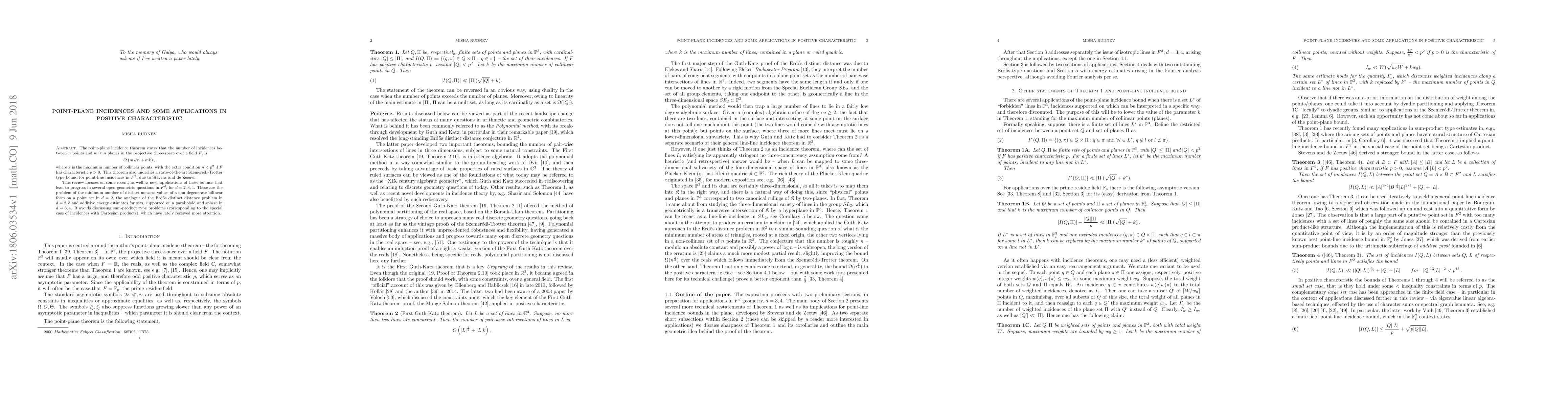 The point-plane incidence theorem states that the number of incidences between $n$ points and $m\geq n$ planes in the projective three-space over a field $F$, is $$O\left(m\sqrt{n}+ m k\right),$$ where $k$ is the maximum number of collinear points, with the extra condition $n< p^2$ if $F$ has characteristic $p>0$. This theorem also underlies a state-of-the-art Szemer\'edi-Trotter type bound for point-line incidences in $F^2$, due to Stevens and de Zeeuw. This review focuses on some recent, as well as new, applications of these bounds that lead to progress in several open geometric questions in $F^d$, for $d=2,3,4$. These are the problem of the minimum number of distinct nonzero values of a non-degenerate bilinear form on a point set in $d=2$, the analogue of the Erd\H os distinct distance problem in $d=2,3$ and additive energy estimates for sets, supported on a paraboloid and sphere in $d=3,4$. It avoids discussing sum-product type problems (corresponding to the special case of incidences with Cartesian products), which have lately received more attention.