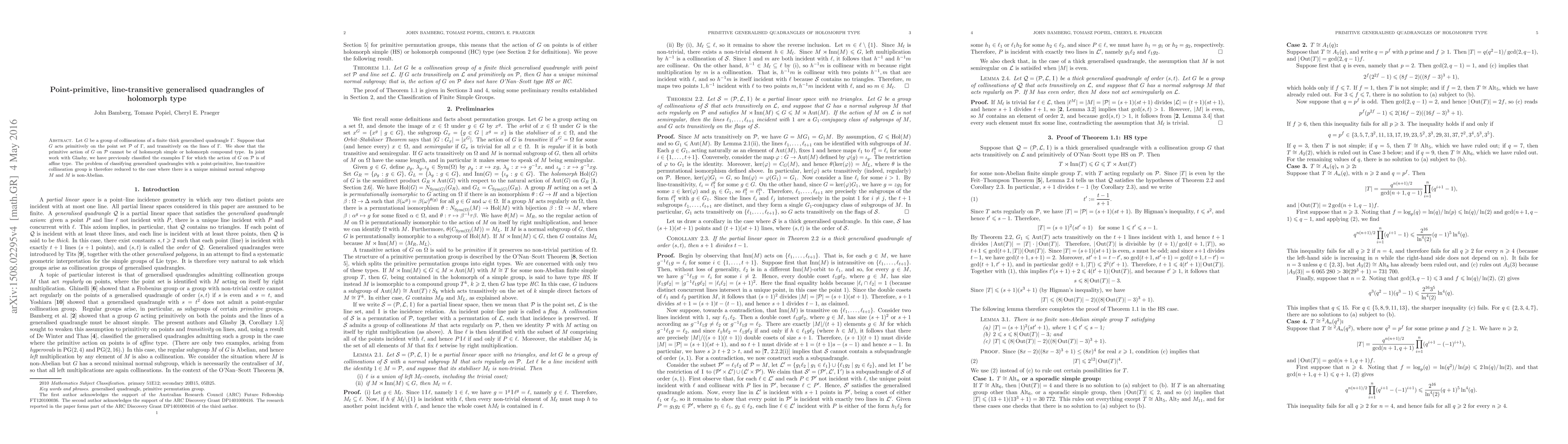 The research employs group theory and combinatorial design, specifically analyzing generalized quadrangles under collineation groups acting transitively on lines and primitively on points.