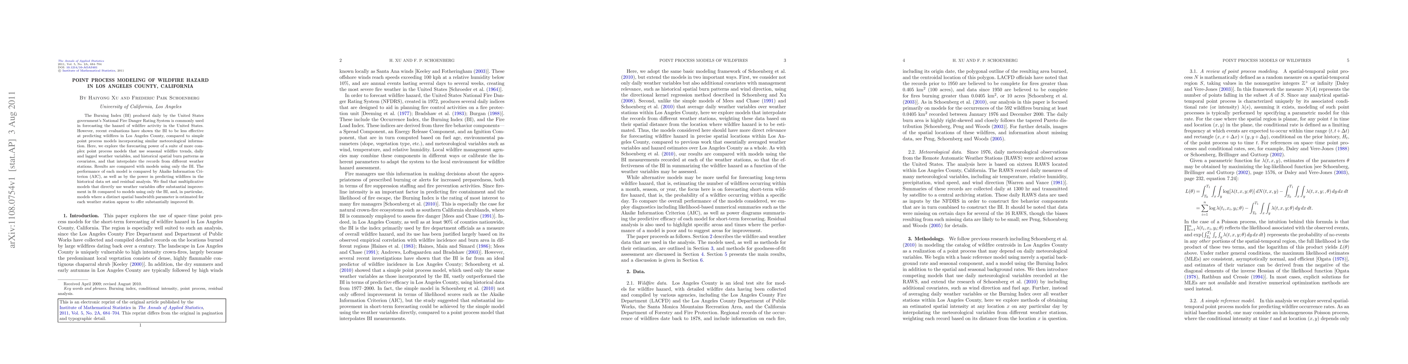 A study compares wildfire hazard forecasting models in Los Angeles County, finding that more complex point process models using weather variables offer improved fit than the Burning Index alone, particularly when spatial bandwidth parameters are estimated for each weather station.