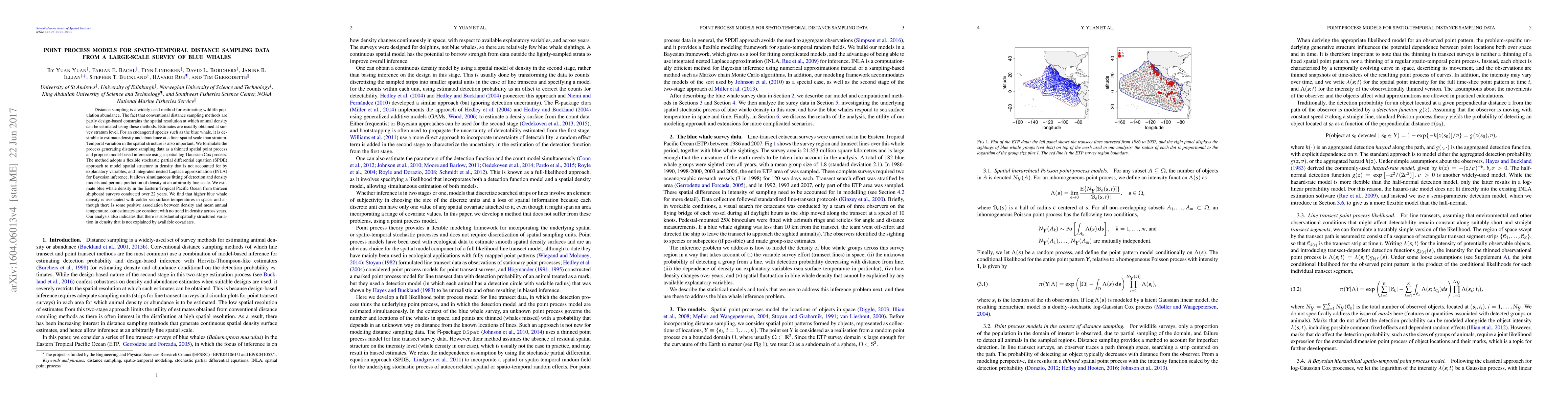 Distance sampling is a widely used method for estimating wildlife population abundance. The fact that conventional distance sampling methods are partly design-based constrains the spatial resolution at which animal density can be estimated using these methods. Estimates are usually obtained at survey stratum level. For an endangered species such as the blue whale, it is desirable to estimate density and abundance at a finer spatial scale than stratum. Temporal variation in the spatial structure is also important. We formulate the process generating distance sampling data as a thinned spatial point process and propose model-based inference using a spatial log-Gaussian Cox process. The method adopts a flexible stochastic partial differential equation (SPDE) approach to model spatial structure in density that is not accounted for by explanatory variables, and integrated nested Laplace approximation (INLA) for Bayesian inference. It allows simultaneous fitting of detection and density models and permits prediction of density at an arbitrarily fine scale. We estimate blue whale density in the Eastern Tropical Pacific Ocean from thirteen shipboard surveys conducted over 22 years. We find that higher blue whale density is associated with colder sea surface temperatures in space, and although there is some positive association between density and mean annual temperature, our estimates are consitent with no trend in density across years. Our analysis also indicates that there is substantial spatially structured variation in density that is not explained by available covariates.