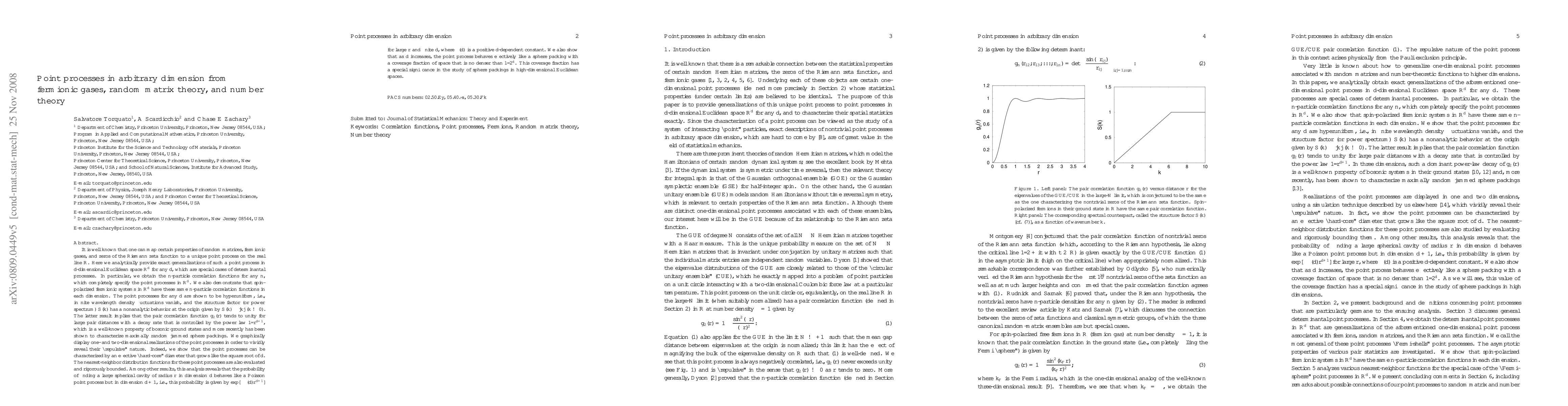 It is well known that one can map certain properties of random matrices, fermionic gases, and zeros of the Riemann zeta function to a unique point process on the real line. Here we analytically provide exact generalizations of such a point process in d-dimensional Euclidean space for any d, which are special cases of determinantal processes. In particular, we obtain the n-particle correlation functions for any n, which completely specify the point processes. We also demonstrate that spin-polarized fermionic systems have these same n-particle correlation functions in each dimension. The point processes for any d are shown to be hyperuniform. The latter result implies that the pair correlation function tends to unity for large pair distances with a decay rate that is controlled by the power law r^[-(d+1)]. We graphically display one- and two-dimensional realizations of the point processes in order to vividly reveal their "repulsive" nature. Indeed, we show that the point processes can be characterized by an effective "hard-core" diameter that grows like the square root of d. The nearest-neighbor distribution functions for these point processes are also evaluated and rigorously bounded. Among other results, this analysis reveals that the probability of finding a large spherical cavity of radius r in dimension d behaves like a Poisson point process but in dimension d+1 for large r and finite d. We also show that as d increases, the point process behaves effectively like a sphere packing with a coverage fraction of space that is no denser than 1/2^d.