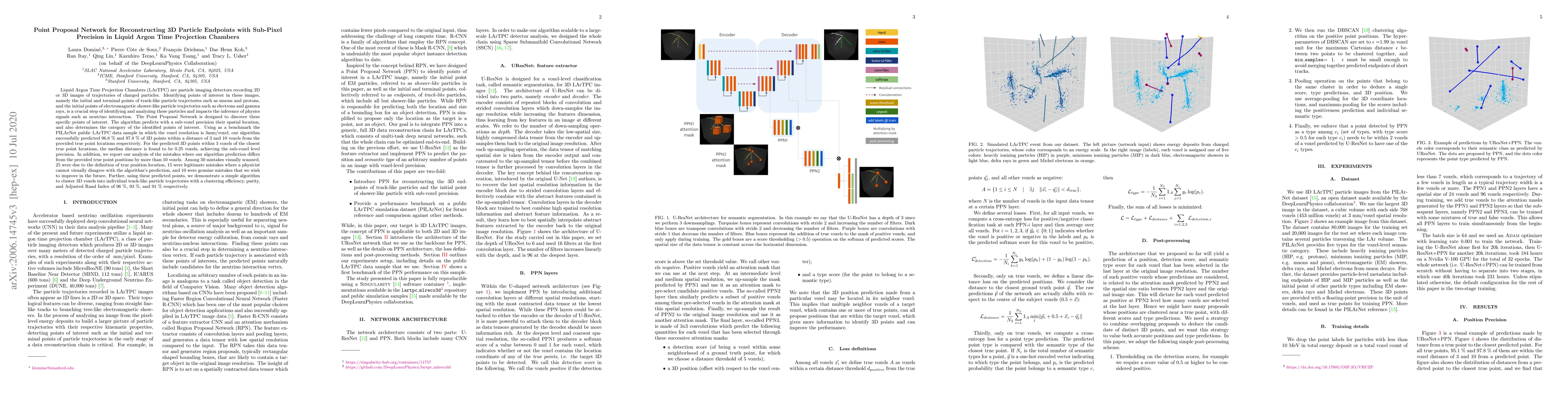 The Point Proposal Network algorithm reconstructs 3D particle endpoints with sub-pixel precision in Liquid Argon Time Projection Chambers, achieving 96.8% accuracy within 3 voxels and demonstrating sub-voxel precision. It also clusters 3D voxels into particle trajectories with 96% efficiency and 91% Adjusted Rand Index.