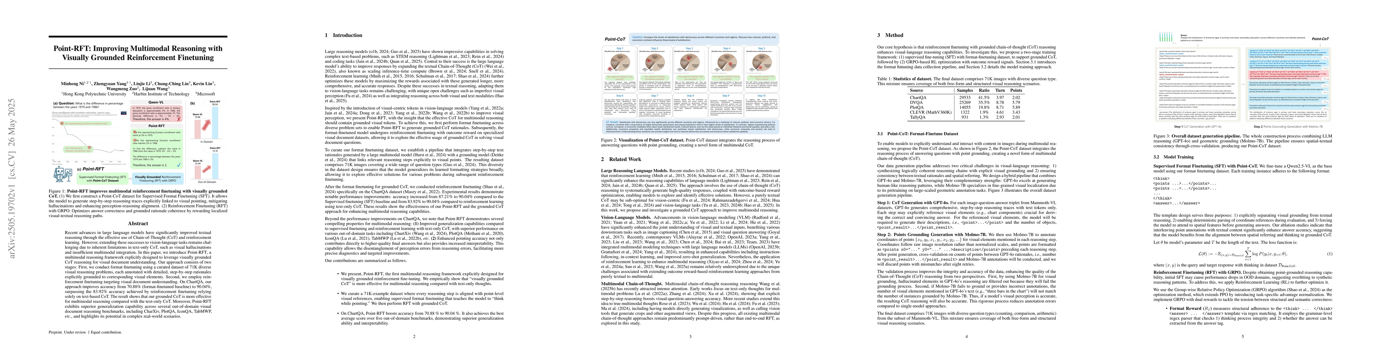 This paper introduces Point-RFT, a multimodal reasoning framework that improves visual document understanding through visually grounded Chain-of-Thought (CoT) reasoning, outperforming text-only CoT in accuracy and generalization capabilities.