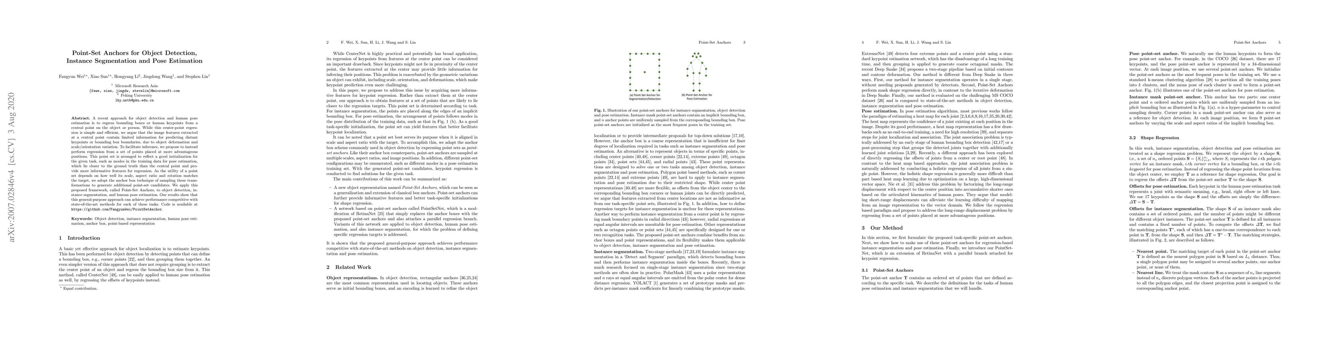 This paper proposes Point-Set Anchors, a framework that uses a set of strategically placed points instead of a central point for object detection, instance segmentation, and pose estimation, to provide more informative features. The method achieves competitive performance with state-of-the-art techniques by sampling transformations to generate optimal point sets.