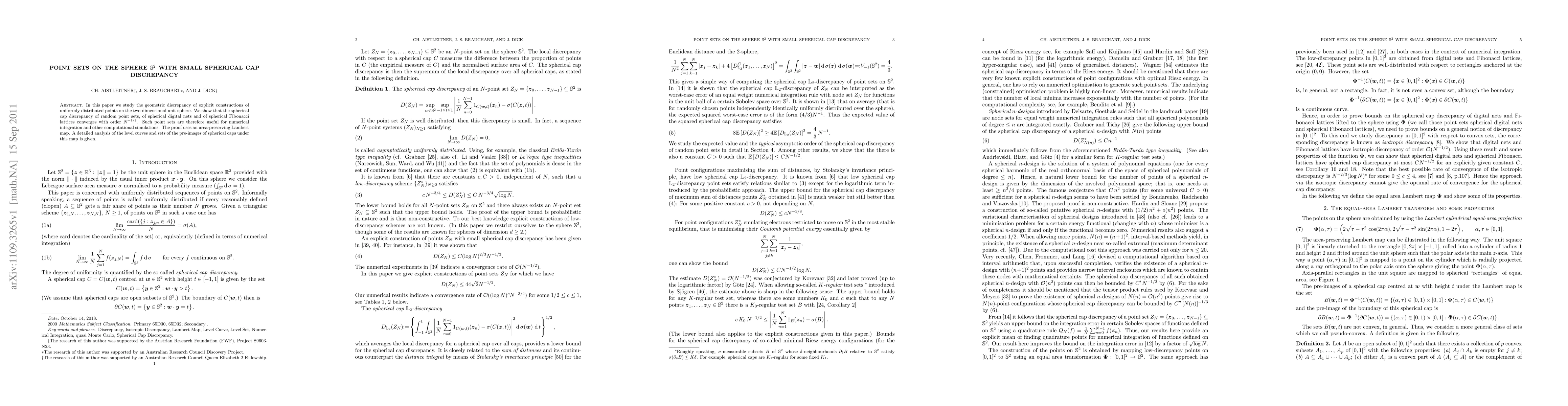 The paper presents a detailed analysis of spherical cap discrepancy using Lambert projection and provides explicit constructions of point sets with optimal discrepancy behavior on the sphere.