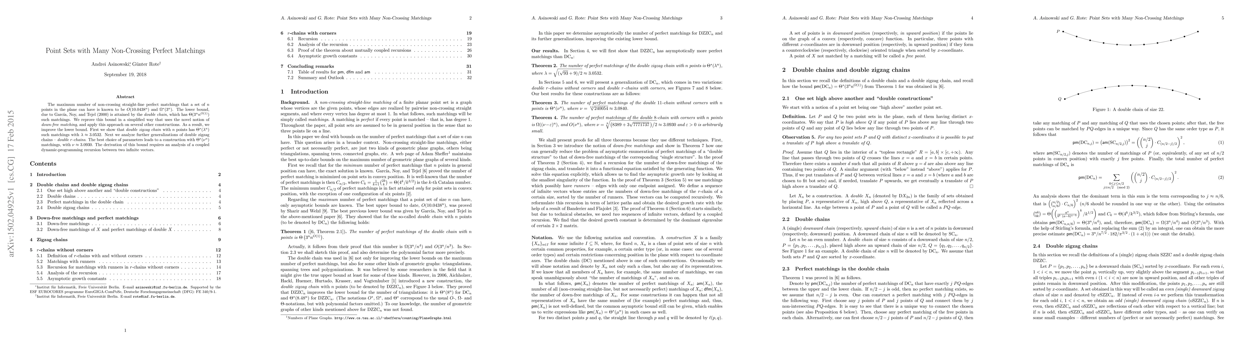 The maximum number of non-crossing straight-line perfect matchings that a set of $n$ points in the plane can have is known to be $O(10.0438^n)$ and $\Omega^*(3^n)$. The lower bound, due to Garc\'ia, Noy, and Tejel (2000) is attained by the double chain, which has $\Theta(3^n n^{O(1)})$ such matchings. We reprove this bound in a simplified way that uses the novel notion of down-free matching, and apply this approach on several other constructions. As a result, we improve the lower bound. First we show that double zigzag chain with $n$ points has $\Theta^*(\lambda^n)$ such matchings with $\lambda \approx 3.0532$. Next we analyze further generalizations of double zigzag chains - double $r$-chains. The best choice of parameters leads to a construction with $\Theta^*(\nu^n)$ matchings, with $\nu \approx 3.0930$. The derivation of this bound requires an analysis of a coupled dynamic-programming recursion between two infinite vectors.