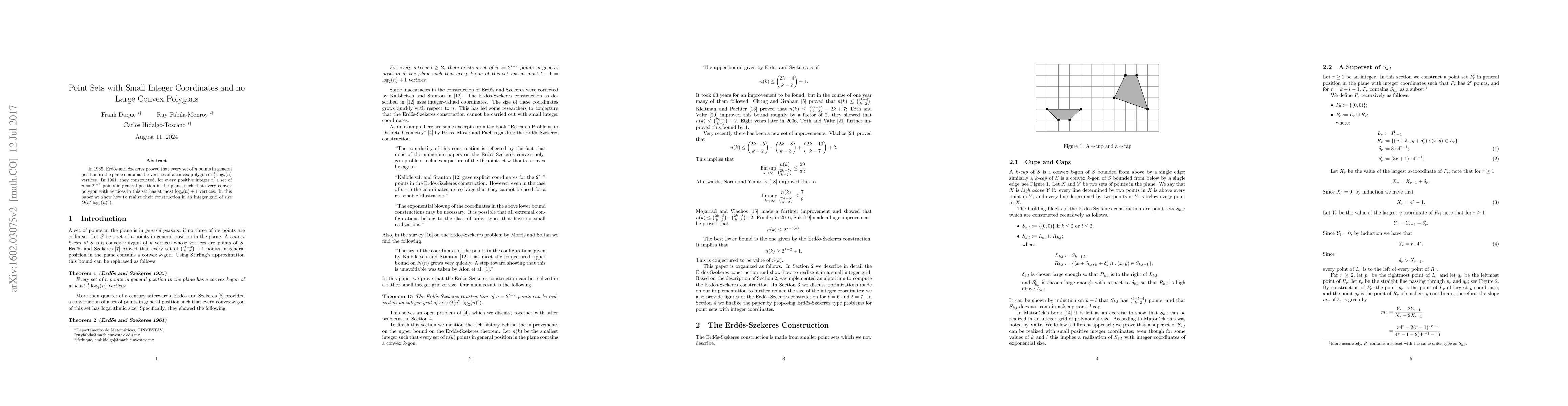 In 1935, Erd\H{o}s and Szekeres proved that every set of $n$ points in general position in the plane contains the vertices of a convex polygon of $\frac{1}{2}\log_2(n)$ vertices. In 1961, they constructed, for every positive integer $t$, a set of $n:=2^{t-2}$ points in general position in the plane, such that every convex polygon with vertices in this set has at most $\log_2(n)+1$ vertices. In this paper we show how to realize their construction in an integer grid of size $O(n^2 \log_2(n)^3)$.