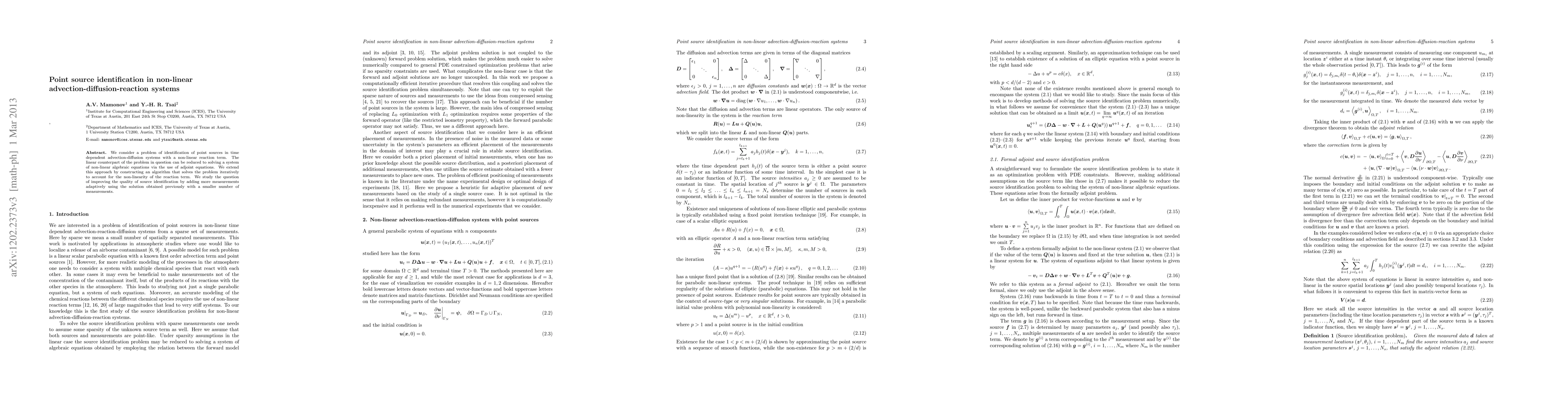 This paper develops an iterative algorithm to identify point sources in time-dependent advection-diffusion systems with non-linear reaction terms, improving source identification quality by adaptively incorporating additional measurements. The method extends linear identification techniques through adjoint equations and non-linear considerations.