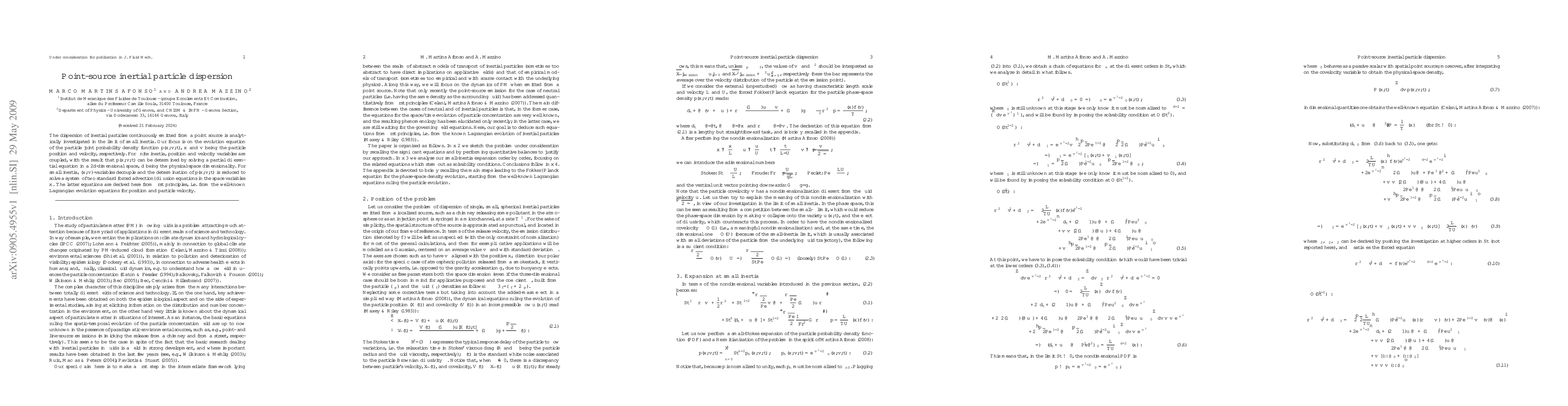 The dispersion of inertial particles continuously emitted from a point source is analytically investigated in the limit of small inertia. Our focus is on the evolution equation of the particle joint probability density function p(x,v,t), x and v being the particle position and velocity, respectively. For finite inertia, position and velocity variables are coupled, with the result that p(x,v,t) can be determined by solving a partial differential equation in a 2d-dimensional space, d being the physical-space dimensionality. For small inertia, (x,v)-variables decouple and the determination of p(x,v,t) is reduced to solve a system of two standard forced advection-diffusion equations in the space variable x. The latter equations are derived here from first principles, i.e. from the well-known Lagrangian evolution equations for position and particle velocity.