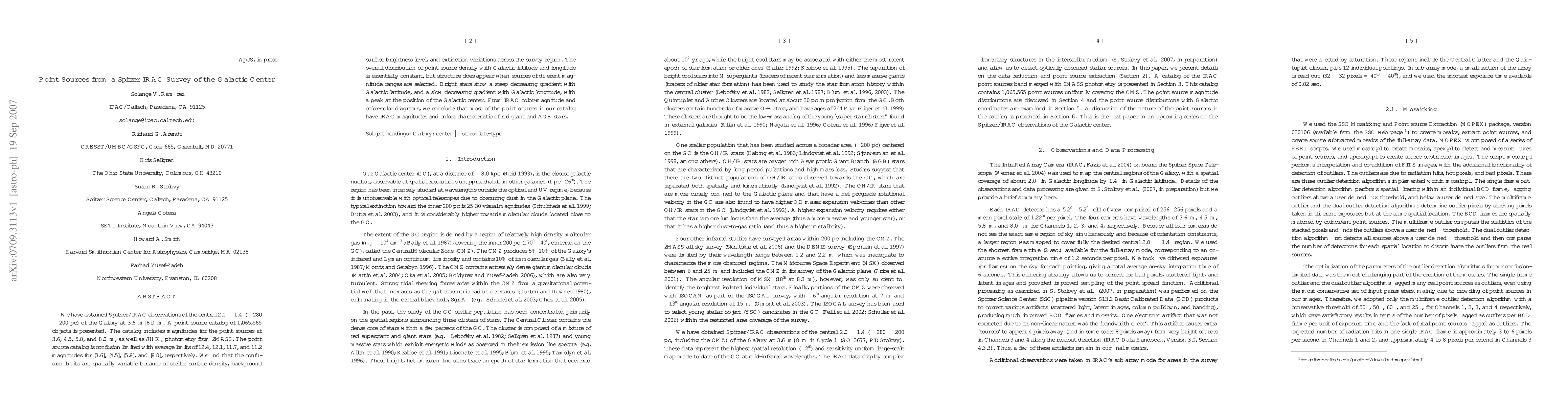This paper presents a catalog of 1,065,565 point sources from Spitzer IRAC observations of the Galactic Center, detailing their magnitudes across multiple infrared wavelengths. The study finds that the catalog's confusion limits vary spatially due to factors like stellar density and extinction, and identifies most sources as red giant and AGB stars based on their IRAC colors and magnitudes.