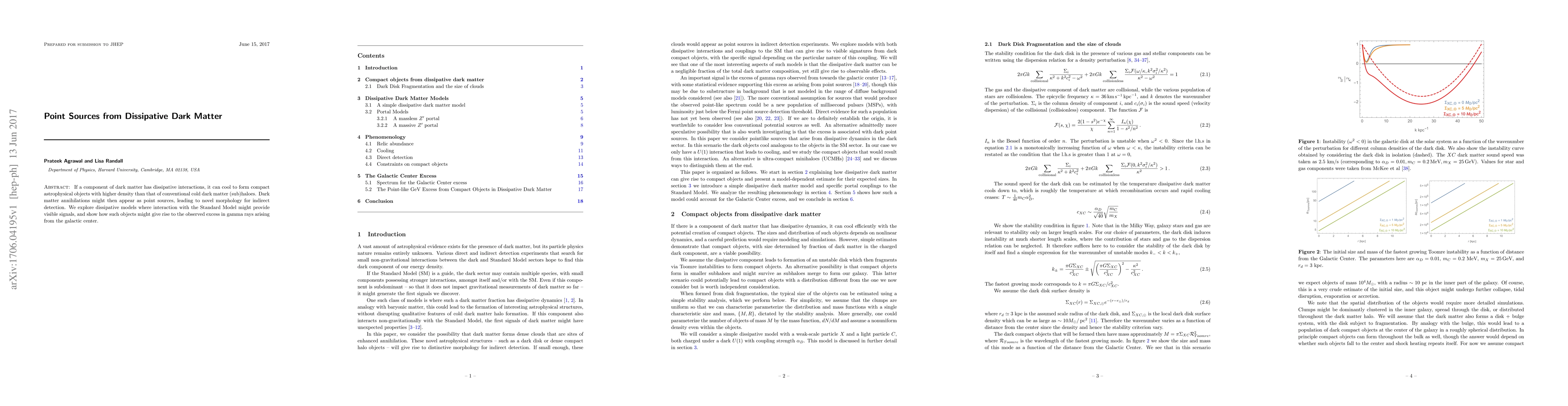 If a component of dark matter has dissipative interactions, it can cool to form compact astrophysical objects with higher density than that of conventional cold dark matter (sub)haloes. Dark matter annihilations might then appear as point sources, leading to novel morphology for indirect detection. We explore dissipative models where interaction with the Standard Model might provide visible signals, and show how such objects might give rise to the observed excess in gamma rays arising from the galactic center.