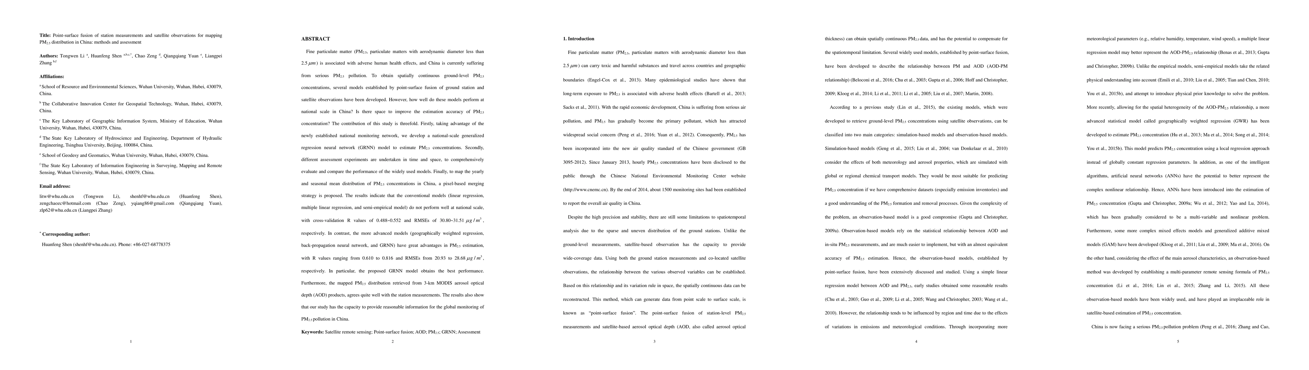 This study develops a national-scale generalized regression neural network (GRNN) model to estimate PM2.5 concentrations in China using point-surface fusion of ground station and satellite observations. Advanced models like GRNN outperform conventional ones, achieving better estimation accuracy and providing a reliable PM2.5 distribution map.
