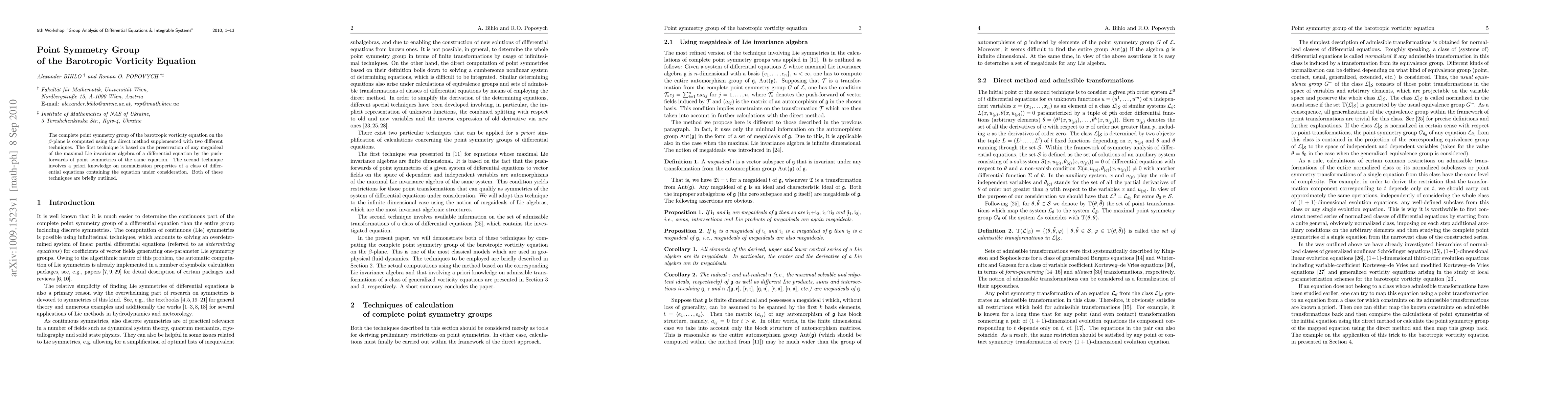 The complete point symmetry group of the barotropic vorticity equation on the $\beta$-plane is computed using the direct method supplemented with two different techniques. The first technique is based on the preservation of any megaideal of the maximal Lie invariance algebra of a differential equation by the push-forwards of point symmetries of the same equation. The second technique involves a priori knowledge on normalization properties of a class of differential equations containing the equation under consideration. Both of these techniques are briefly outlined.
