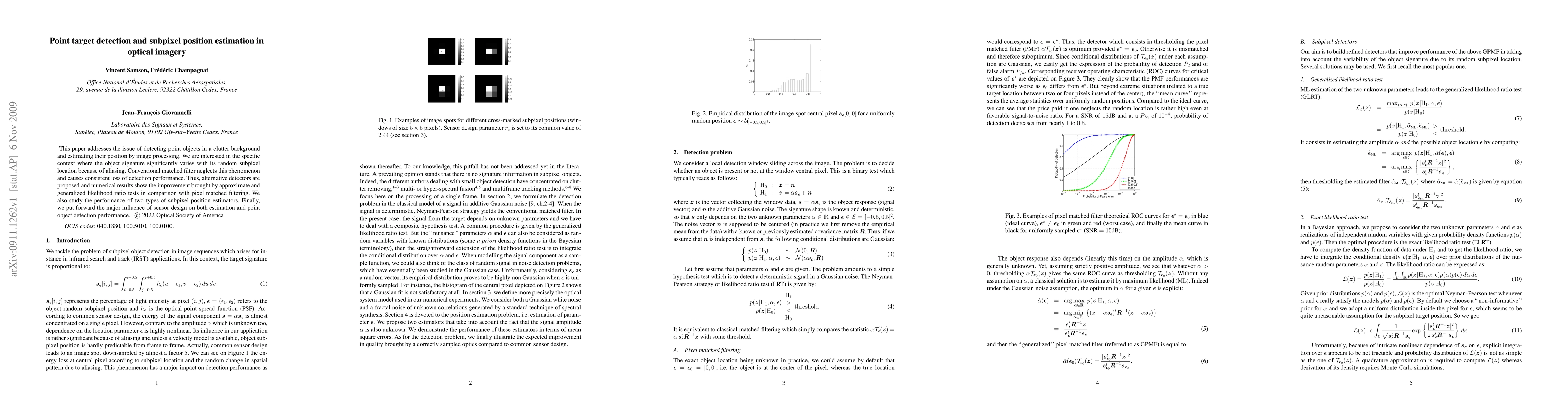 This paper addresses the issue of detecting point objects in a clutter background and estimating their position by image processing. We are interested in the specific context where the object signature significantly varies with its random subpixel location because of aliasing. Conventional matched filter neglects this phenomenon and causes consistent loss of detection performance. Thus, alternative detectors are proposed and numerical results show the improvement brought by approximate and generalized likelihood ratio tests in comparison with pixel matched filtering. We also study the performance of two types of subpixel position estimators. Finally, we put forward the major influence of sensor design on both estimation and point object detection performance.