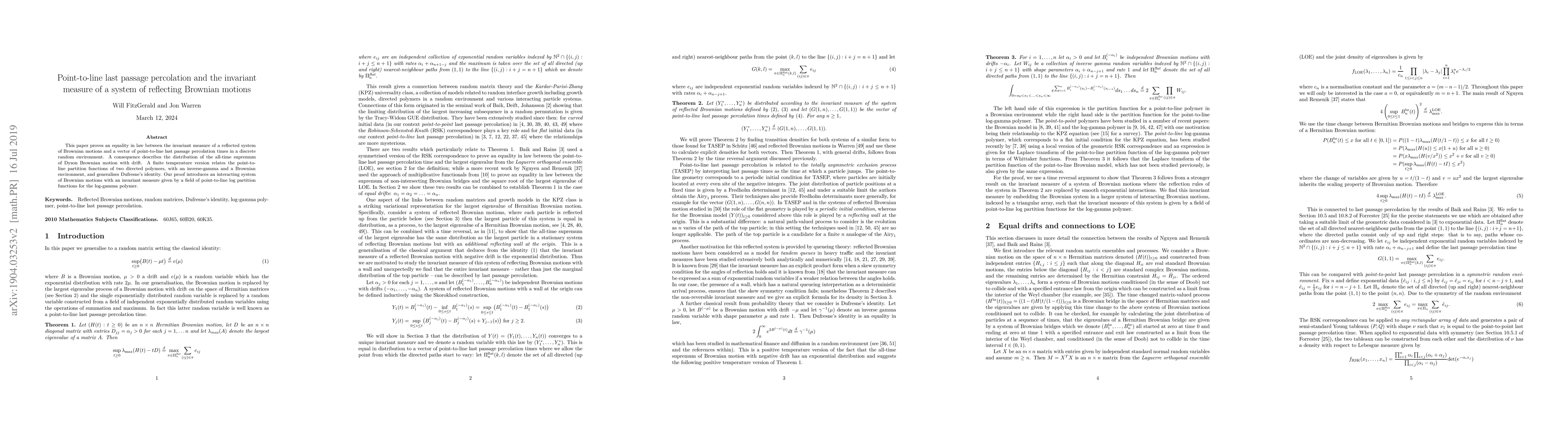 This paper establishes an equivalence between the invariant measure of a reflected Brownian motion system and point-to-line last passage percolation times, with implications for the distribution of the all-time supremum of Dyson Brownian motion. It also generalizes Dufresne's identity for finite temperature directed polymers.
