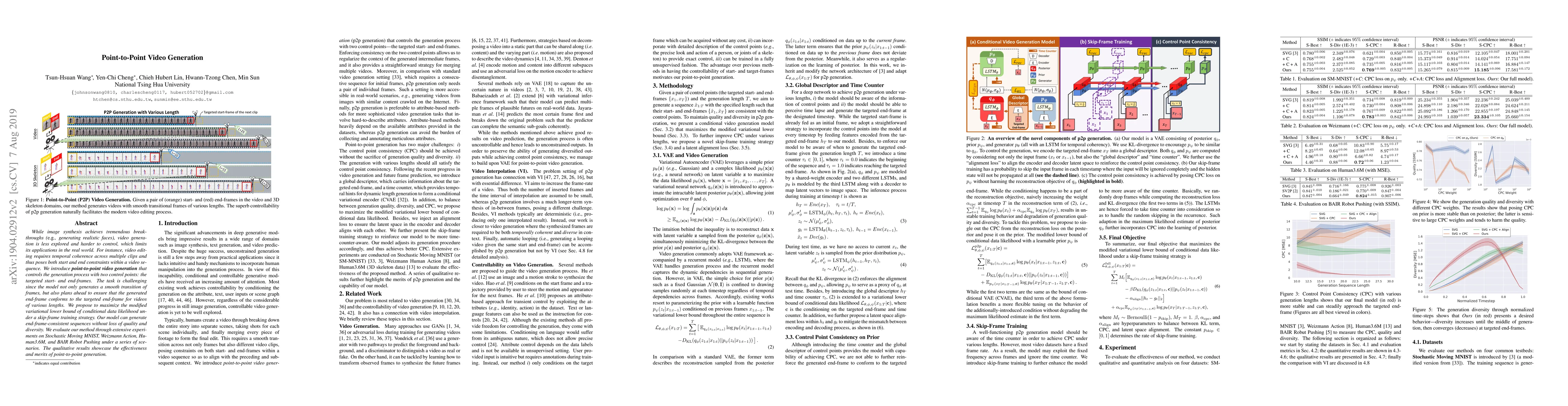 While image manipulation achieves tremendous breakthroughs (e.g., generating realistic faces) in recent years, video generation is much less explored and harder to control, which limits its applications in the real world. For instance, video editing requires temporal coherence across multiple clips and thus poses both start and end constraints within a video sequence. We introduce point-to-point video generation that controls the generation process with two control points: the targeted start- and end-frames. The task is challenging since the model not only generates a smooth transition of frames, but also plans ahead to ensure that the generated end-frame conforms to the targeted end-frame for videos of various length. We propose to maximize the modified variational lower bound of conditional data likelihood under a skip-frame training strategy. Our model can generate sequences such that their end-frame is consistent with the targeted end-frame without loss of quality and diversity. Extensive experiments are conducted on Stochastic Moving MNIST, Weizmann Human Action, and Human3.6M to evaluate the effectiveness of the proposed method. We demonstrate our method under a series of scenarios (e.g., dynamic length generation) and the qualitative results showcase the potential and merits of point-to-point generation. For project page, see https://zswang666.github.io/P2PVG-Project-Page/