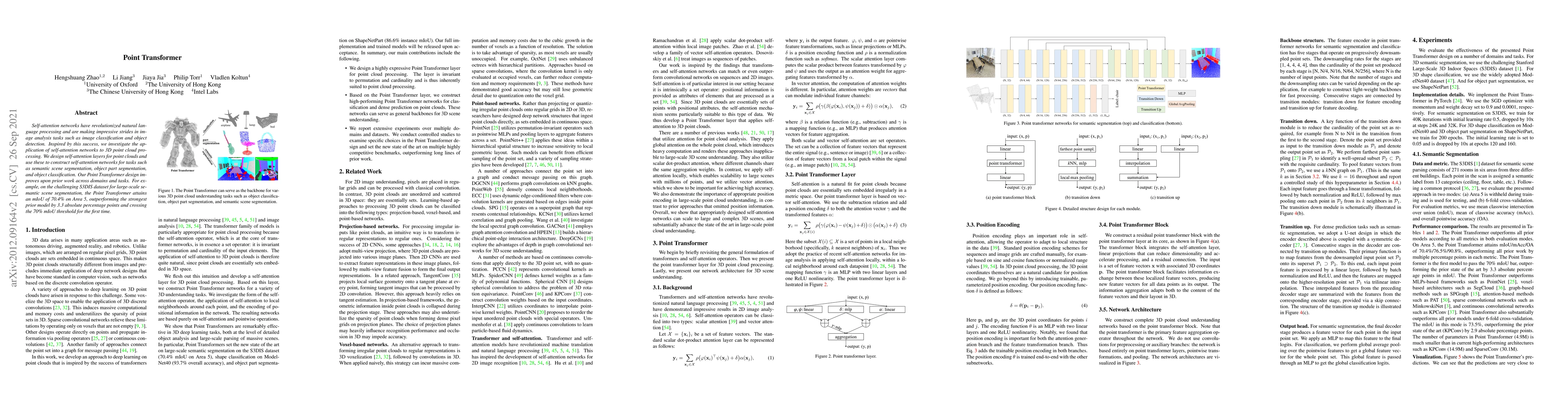 The Point Transformer applies self-attention networks to 3D point cloud processing, achieving superior results in semantic scene segmentation, object part segmentation, and object classification. On the S3DIS dataset, it attains an mIoU of 70.4% on Area 5, surpassing the previous best model by 3.3 percentage points.