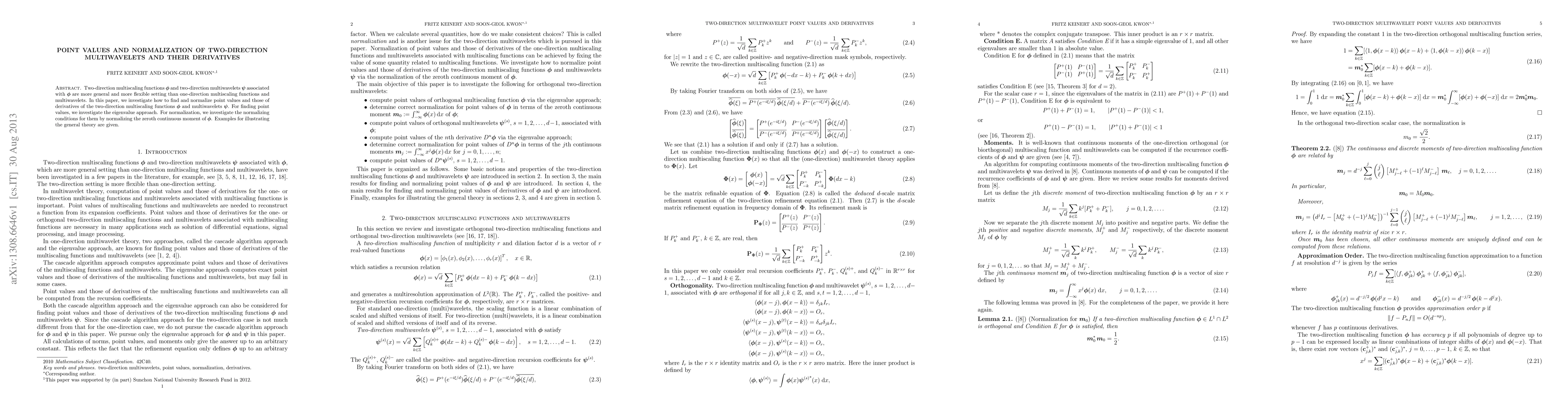 Two-direction multiscaling functions $\boldsymbol{\phi}$ and two-direction multiwavelets $\boldsymbol{\psi}$ associated with $\boldsymbol{\phi}$ are more general and more flexible setting than one-direction multiscaling functions and multiwavelets. In this paper, we investigate how to find and normalize point values and those of derivatives of the two-direction multiscaling functions $\boldsymbol{\phi}$ and multiwavelets $\boldsymbol{\psi}$. %associated with $\boldsymbol{\phi}$. For finding point values, we investigate the eigenvalue approach. For normalization, we investigate the normalizing conditions for them by normalizing the zeroth continuous moment of $\boldsymbol{\phi}$. Examples for illustrating the general theory are given.