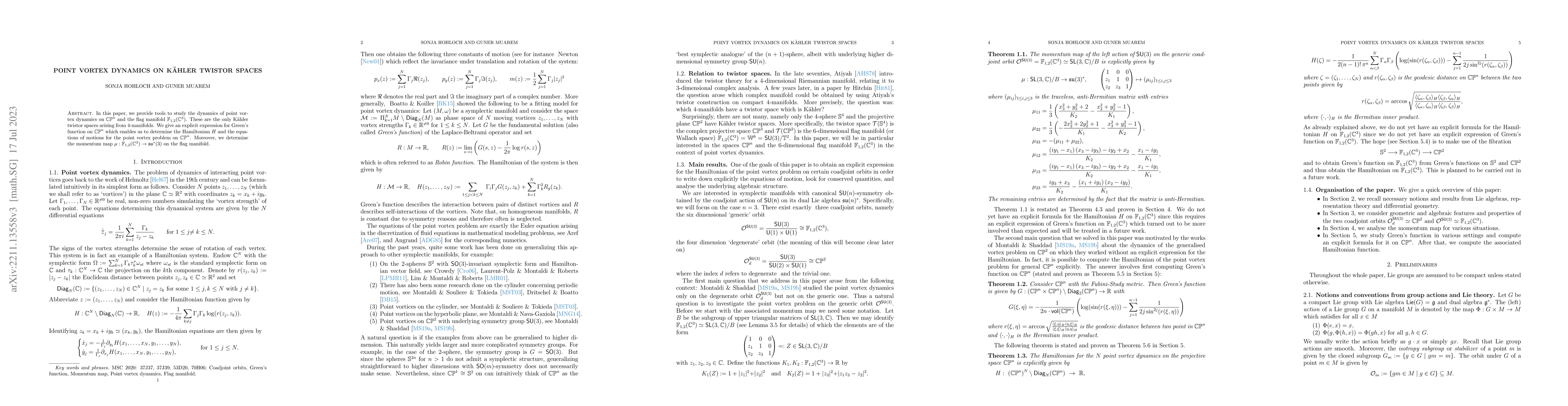 This paper introduces tools for studying point vortex dynamics on Kähler twistor spaces, specifically $\mathbb{CP}^n$ and $\mathbb{F}_{1,2}(\mathbb{C}^3)$. It provides an explicit Green's function on $\mathbb{CP}^n$ to derive the Hamiltonian and motion equations, and determines the momentum map on the flag manifold.