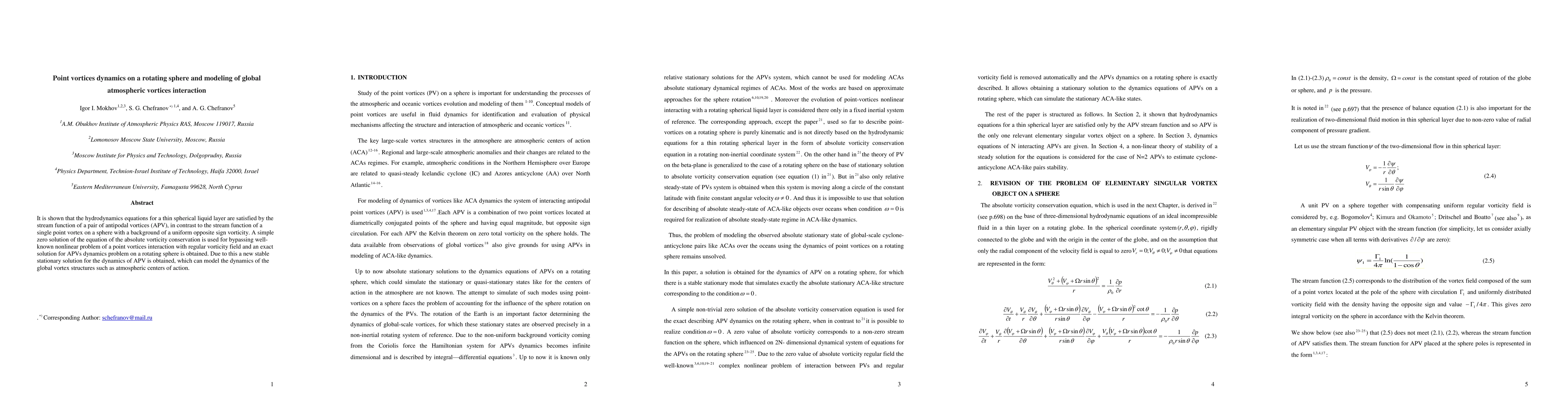 This paper presents an exact solution for the dynamics of antipodal vortices (APV) on a rotating sphere, showing that the hydrodynamics equations are satisfied by their stream function. This approach bypasses the complex problem of point vortices interaction, leading to a stable stationary solution that models global atmospheric vortex structures.