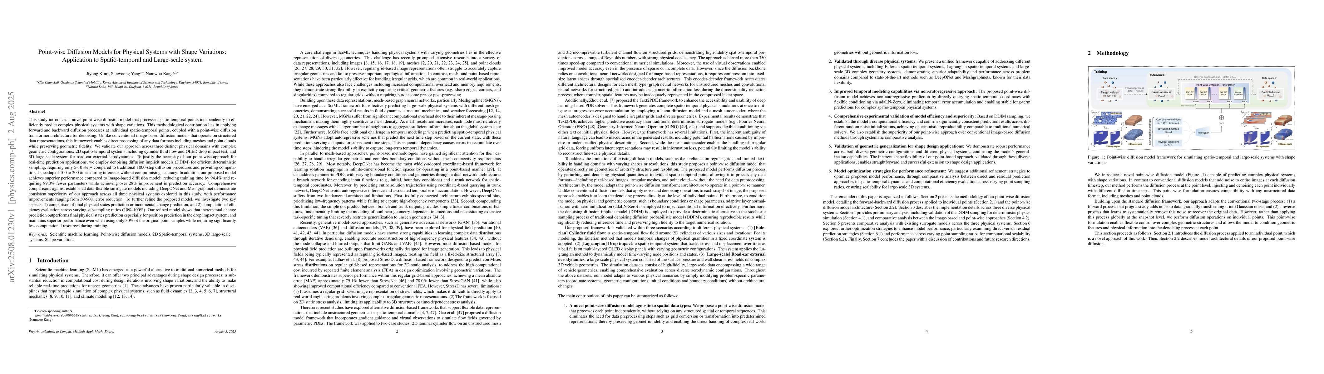 This study introduces a novel point-wise diffusion model that processes spatio-temporal points independently to efficiently predict complex physical systems with shape variations. This methodological contribution lies in applying forward and backward diffusion processes at individual spatio-temporal points, coupled with a point-wise diffusion transformer architecture for denoising. Unlike conventional image-based diffusion models that operate on structured data representations, this framework enables direct processing of any data formats including meshes and point clouds while preserving geometric fidelity. We validate our approach across three distinct physical domains with complex geometric configurations: 2D spatio-temporal systems including cylinder fluid flow and OLED drop impact test, and 3D large-scale system for road-car external aerodynamics. To justify the necessity of our point-wise approach for real-time prediction applications, we employ denoising diffusion implicit models (DDIM) for efficient deterministic sampling, requiring only 5-10 steps compared to traditional 1000-step and providing computational speedup of 100 to 200 times during inference without compromising accuracy. In addition, our proposed model achieves superior performance compared to image-based diffusion model: reducing training time by 94.4% and requiring 89.0% fewer parameters while achieving over 28% improvement in prediction accuracy. Comprehensive comparisons against data-flexible surrogate models including DeepONet and Meshgraphnet demonstrate consistent superiority of our approach across all three physical systems. To further refine the proposed model, we investigate two key aspects: 1) comparison of final physical states prediction or incremental change prediction, and 2) computational efficiency evaluation across varying subsampling ratios (10%-100%).
