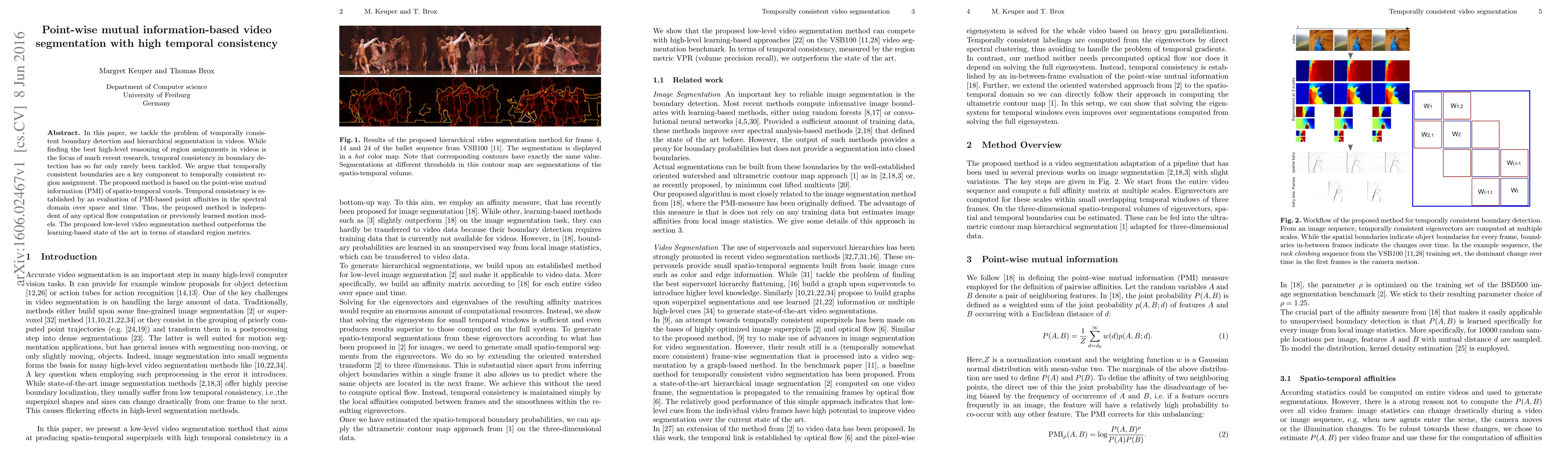 A new video segmentation method using point-wise mutual information achieves high temporal consistency without relying on optical flow computation or motion models, outperforming state-of-the-art learning-based methods.