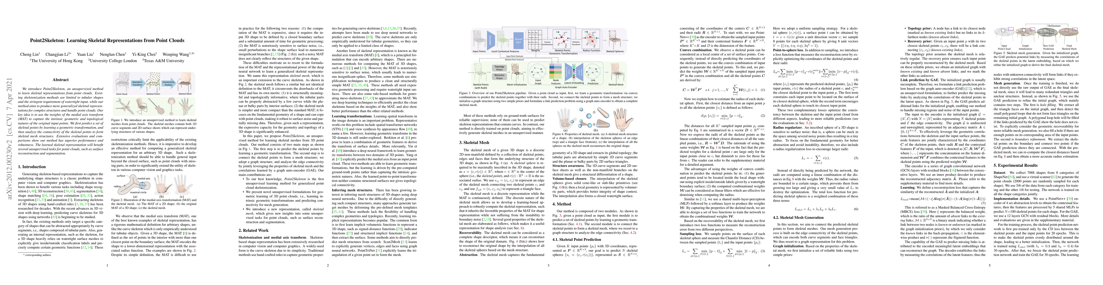 Point2Skeleton is an unsupervised method for deriving skeletal representations from point clouds, overcoming limitations of existing methods that focus on tubular shapes and require watertight inputs. It leverages the medial axis transform to generate generalized skeletal meshes for complex structures, demonstrating superior performance and robustness in evaluations.
