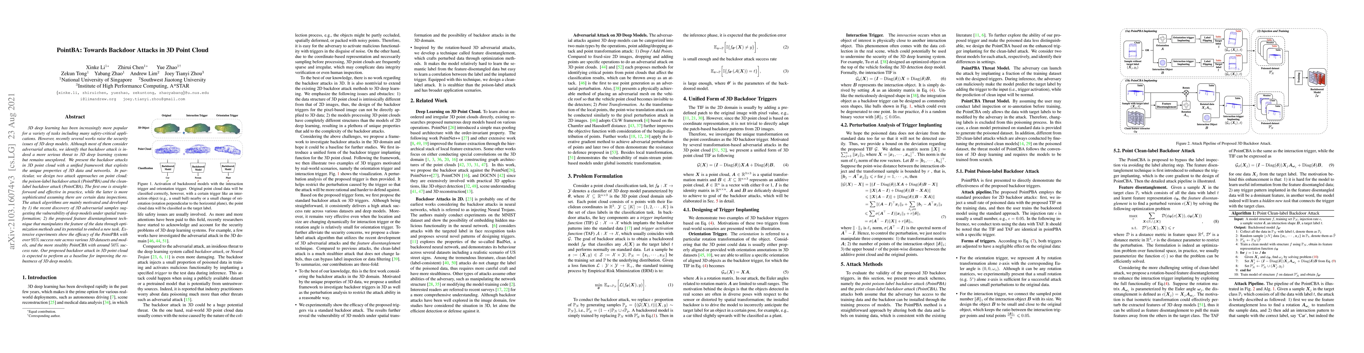 3D deep learning has been increasingly more popular for a variety of tasks including many safety-critical applications. However, recently several works raise the security issues of 3D deep models. Although most of them consider adversarial attacks, we identify that backdoor attack is indeed a more serious threat to 3D deep learning systems but remains unexplored. We present the backdoor attacks in 3D point cloud with a unified framework that exploits the unique properties of 3D data and networks. In particular, we design two attack approaches on point cloud: the poison-label backdoor attack (PointPBA) and the clean-label backdoor attack (PointCBA). The first one is straightforward and effective in practice, while the latter is more sophisticated assuming there are certain data inspections. The attack algorithms are mainly motivated and developed by 1) the recent discovery of 3D adversarial samples suggesting the vulnerability of deep models under spatial transformation; 2) the proposed feature disentanglement technique that manipulates the feature of the data through optimization methods and its potential to embed a new task. Extensive experiments show the efficacy of the PointPBA with over 95% success rate across various 3D datasets and models, and the more stealthy PointCBA with around 50% success rate. Our proposed backdoor attack in 3D point cloud is expected to perform as a baseline for improving the robustness of 3D deep models.