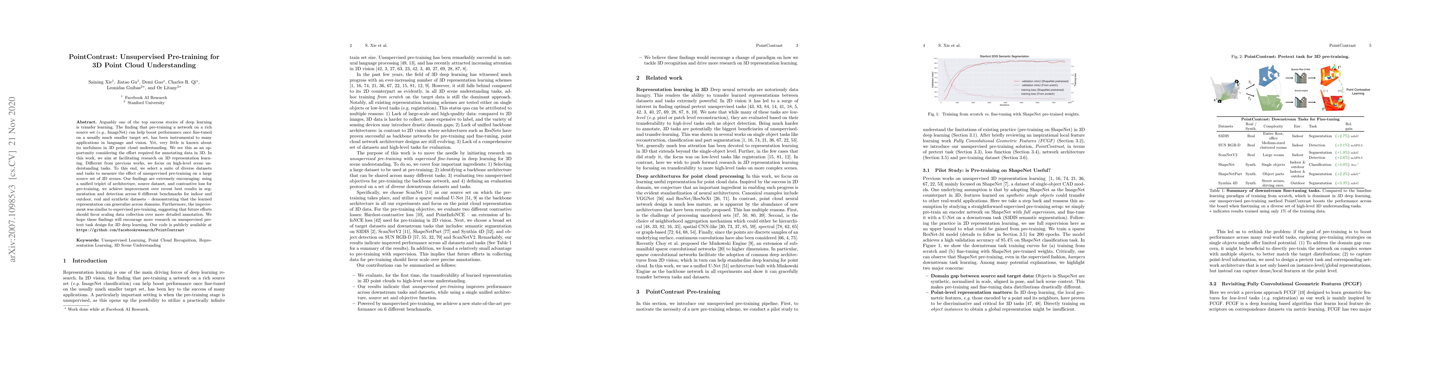 This paper introduces PointContrast, an unsupervised pre-training method for 3D point cloud understanding, achieving significant improvements in segmentation and detection across various benchmarks. The results suggest that scaling data collection is more beneficial than detailed annotation, encouraging future research in unsupervised pretext tasks for 3D deep learning.