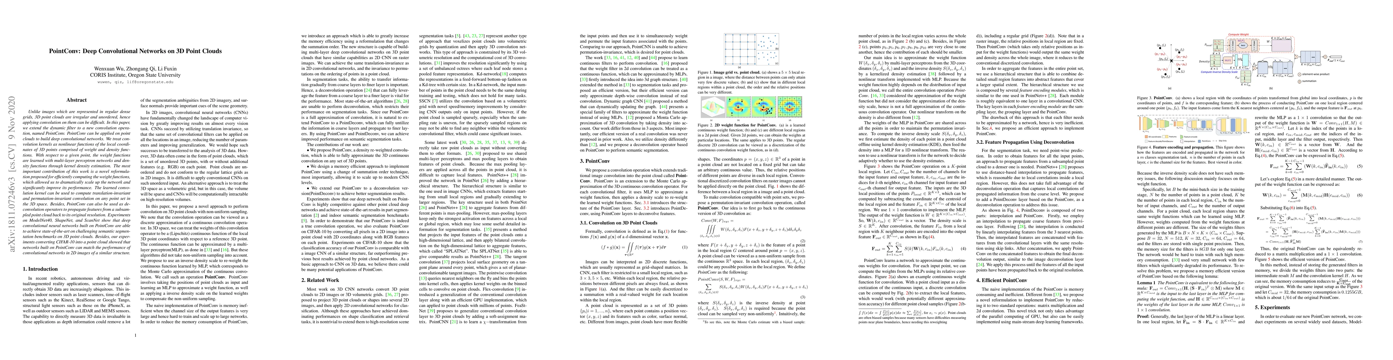 This paper introduces PointConv, a novel convolution operation for deep convolutional networks on 3D point clouds, addressing the challenge of irregular and unordered data. It achieves translation-invariant and permutation-invariant convolution through learned weight and density functions, significantly improving performance and scalability.