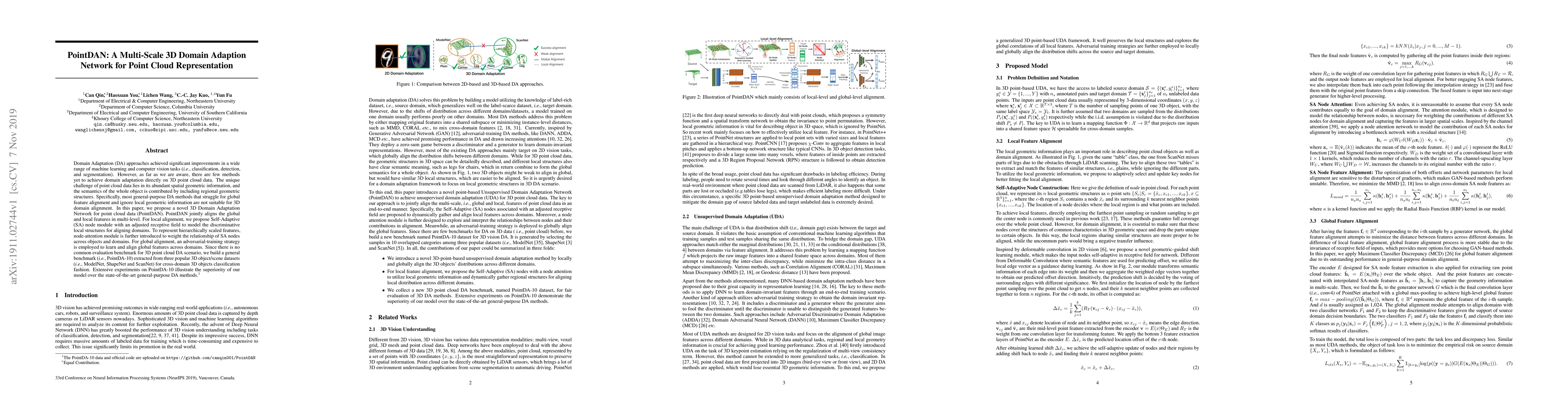 PointDAN is a novel 3D Domain Adaptation Network that aligns both global and local features of point cloud data through multi-scale strategies, including a Self-Adaptive node module and a node-attention module. The model is evaluated on a newly constructed benchmark, PointDA-10, demonstrating superior performance over existing general-purpose domain adaptation methods.