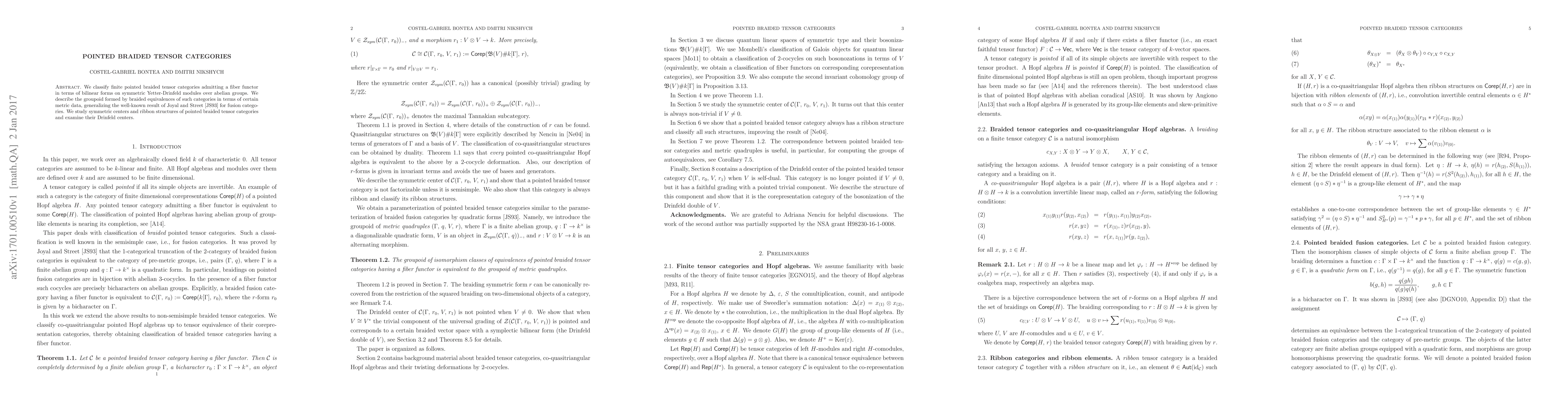 The paper classifies finite pointed braided tensor categories with a fiber functor using bilinear forms on symmetric Yetter-Drinfeld modules over abelian groups, and generalizes Joyal and Street's result on fusion categories. It also examines symmetric centers, ribbon structures, and Drinfeld centers of these categories.
