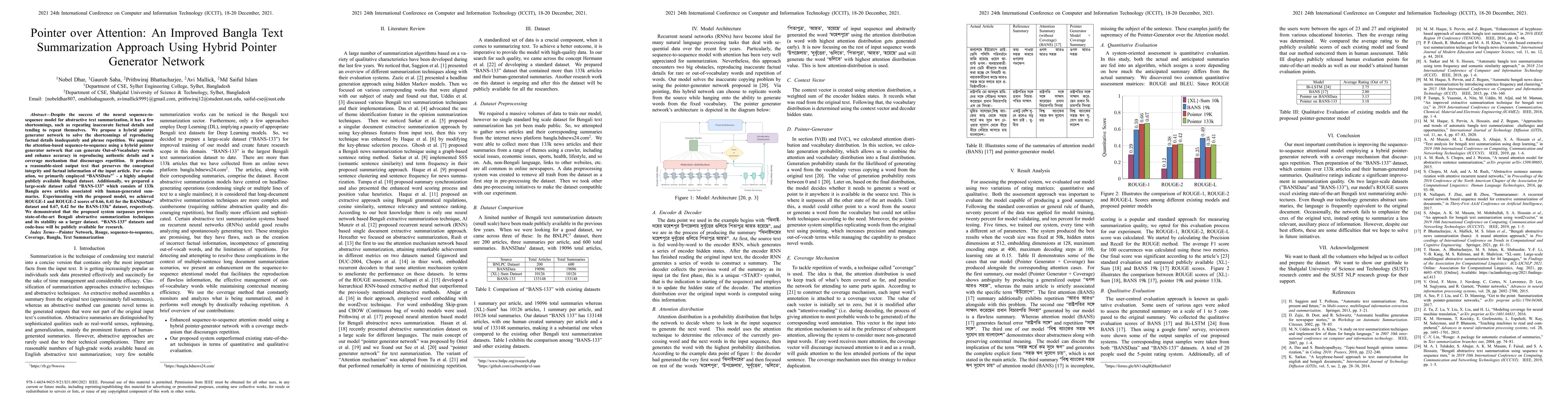 The paper proposes a hybrid pointer generator network to improve Bangla text summarization by generating Out-of-Vocabulary words and reducing factual repetition, achieving higher ROUGE scores on two datasets. The new "BANS-133" dataset and code are made publicly available for further research.