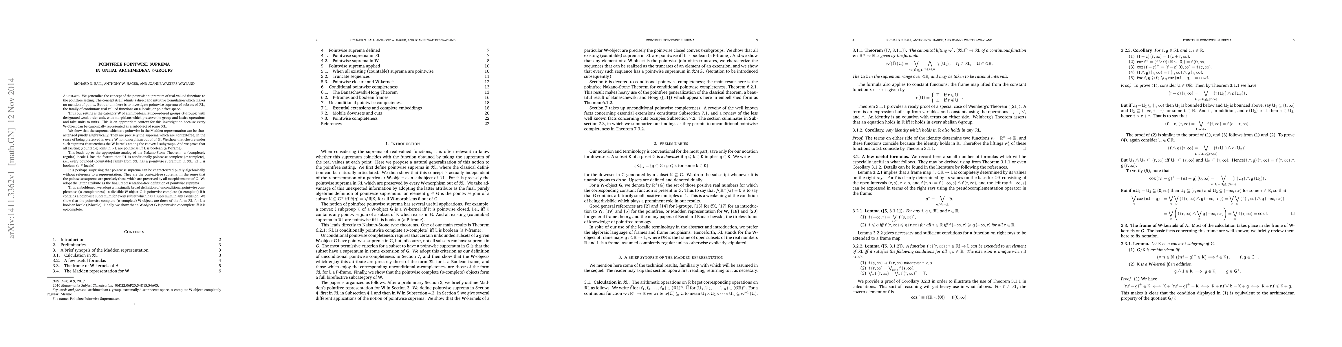 We generalize the concept of the pointwise supremum of real-valued functions to the pointfree setting. The concept itself admits a direct and intuitive formulation which makes no mention of points. But our aim here is to investigate pointwise suprema of subsets of $\mathcal{R}L$, the family of continuous real valued functions on a locale, or pointfree space. Our setting is the category $\mathbf{W}$ of archimedean lattice-ordered groups ($\ell$-groups) with designated weak order unit, with morphisms which preserve the group and lattice operations and take units to units. A main result is the appropriate analog of the Nakano-Stone Theorem: a (completely regular) locale $L$ has the feature that $\mathcal{R}L$ is conditionally pointwise complete ($\sigma $-complete), i.e., every bounded (countable) family from $\mathcal{R}L$ has a pointwise supremum in $\mathcal{R}L$, iff $L $ is boolean (a $P$-locale). We adopt a maximally broad definition of unconditional pointwise completeness ($\sigma$-completeness): a divisible $\mathbf{W}$-object $G$ is pointwise complete ($\sigma$-complete) if it contains a pointwise supremum for every subset which has a supremum in any extension. We show that the pointwise complete ($\sigma$-complete) $\mathbf{W}$-objects are those of the form $\mathcal{R}L$ for $L$ a boolean locale ($P$-locale). Finally, we show that a $\mathbf{W}$-object $G$ is pointwise $\sigma$-complete iff it is epicomplete.