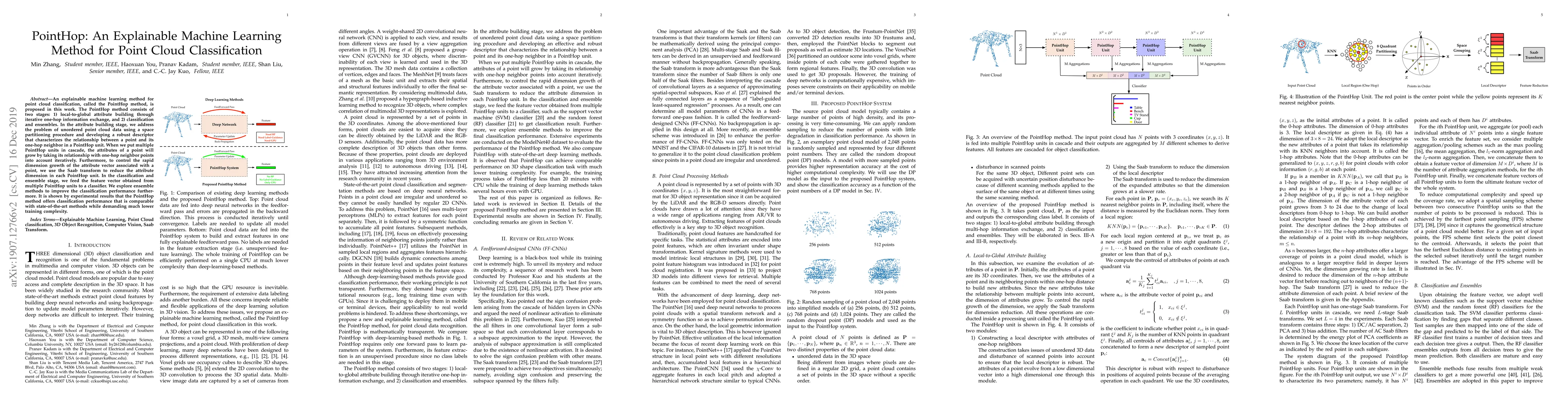 The PointHop method proposes an explainable machine learning approach for point cloud classification, utilizing iterative local-to-global attribute building and ensemble classification to achieve competitive performance with lower training complexity. The method employs space partitioning and robust descriptors to manage unordered point cloud data and uses the Saab transform to manage attribute dimension growth.