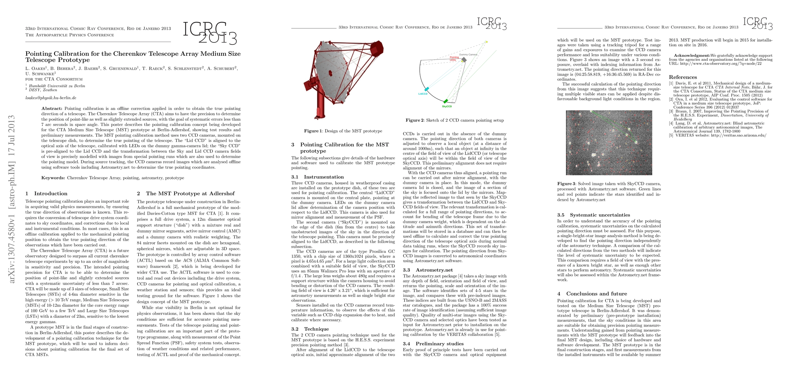 Pointing calibration is an offline correction applied in order to obtain the true pointing direction of a telescope. The Cherenkov Telescope Array (CTA) aims to have the precision to determine the position of point-like as well as slightly extended sources, with the goal of systematic errors less than 7 arc seconds in space angle. This poster describes the pointing calibration concept being developed for the CTA Medium Size Telescope (MST) prototype at Berlin-Adlershof, showing test results and preliminary measurements. The MST pointing calibration method uses two CCD cameras, mounted on the telescope dish, to determine the true pointing of the telescope. The "Lid CCD" is aligned to the optical axis of the telescope, calibrated with LEDs on the dummy gamma-camera lid; the "Sky CCD" is pre-aligned to the Lid CCD and the transformation between the Sky and Lid CCD camera fields of view is precisely modelled with images from special pointing runs which are also used to determine the pointing model. During source tracking, the CCD cameras record images which are analysed offline using software tools including Astrometry.net to determine the true pointing coordinates.
